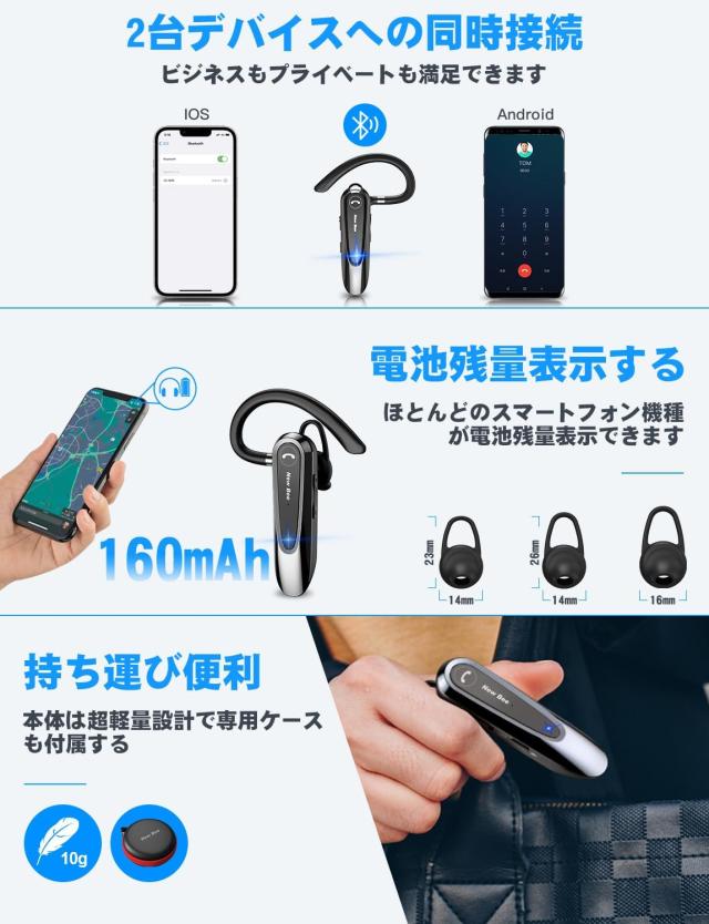 ブルートゥースヘッドセットは耳の肌に触る部分の素材は柔らかいシリコン採用され、長時間つけても負担なし、耳に優しい。
