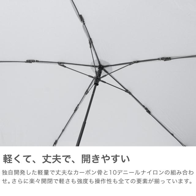 軽さと強度を兼ね備えたカーボンフレームを1から再構築し、スマホより軽く重さを感じさせない「魔法のような軽さ」を叶えた折り畳み傘。すっきりとしたスリムなボディでバッグにも収納しやすく、旅行時にも荷物量を気にせず持っていける安心の1本。親骨55cmの大きめサイズで、悪天候や日差しもしっかりカバーできます。
