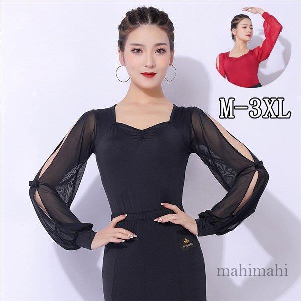 社交ダンス トップス ダンスウェア 半袖 袖あり レディース 社交ダンス衣装 上着 競技着 レッスン 練習着 ラテンダンス モダンダンス 長袖 ブラック レッド ボリューム袖 肌見せ 透け感あり ダンス衣装 上着 ワルツ チャチャチャ ラテン ステージ 衣装 演出着 ダンストップス M/L/XL/2XL/3XL