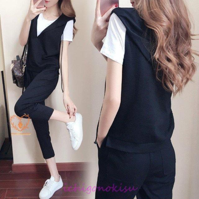 セットアップ レディース 春夏 スウェットセット スポーツウェア 3点セット 半袖tシャツ 七分丈パンツ フード付きベスト 部屋着 ジャージセットアップ