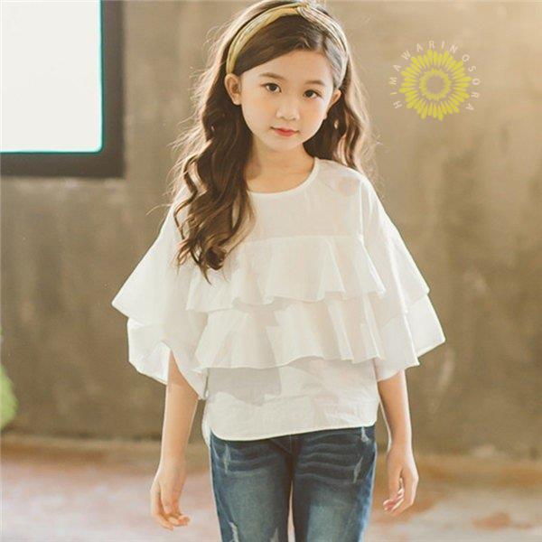 半袖Tシャツ 女の子 半袖トップス 無地 肩フリル 春 夏 プルオーバー キッズ 子ども服 韓国子供服 ジュニア 子供服 ダンス