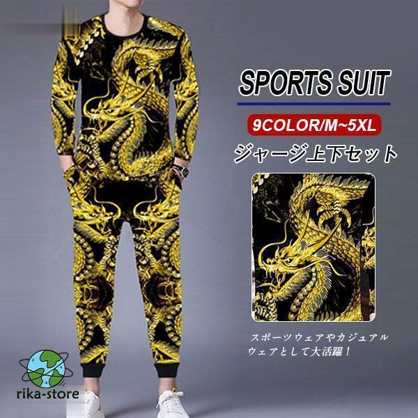 ジャージ メンズ セットアップ 上下セット Tシャツ 長袖 龍柄 細身 ウエストゴム スポーツウェア カジュアル ライニング お兄系 おしゃれ