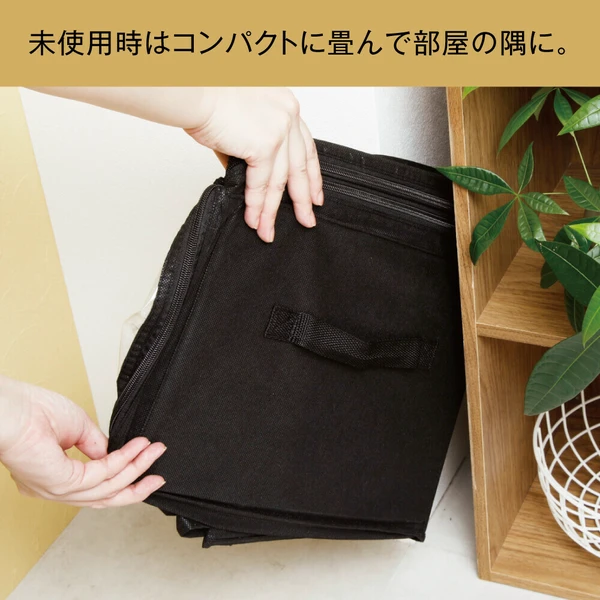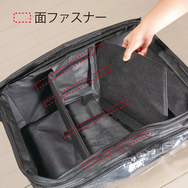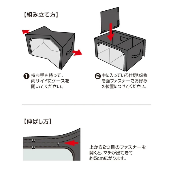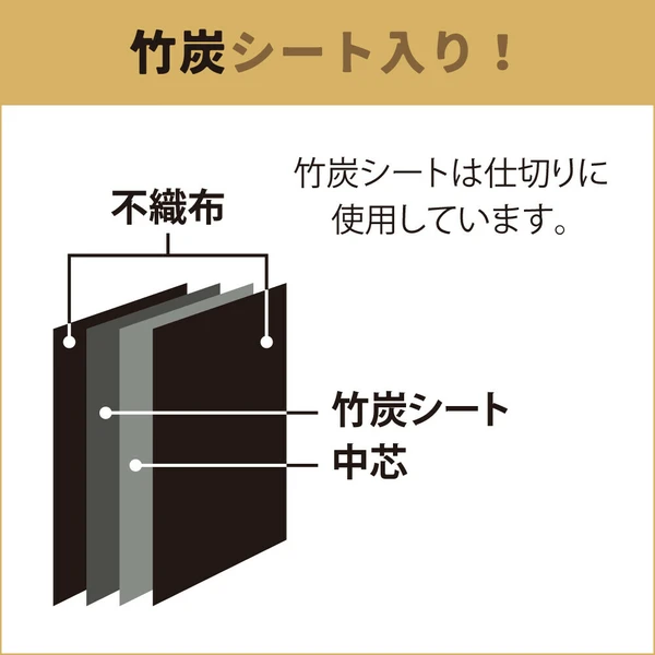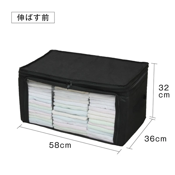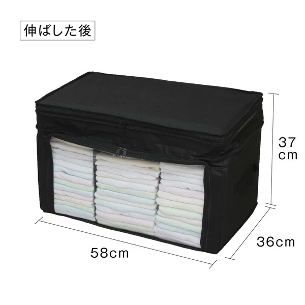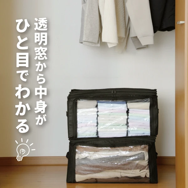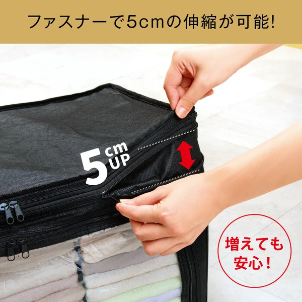 ファスナーを開くと5cm高さがアップ!上から入れて前からも出せる「竹炭収納ケース 衣類用」。●ファスナーで高さの伸縮が可能!かさばる冬物を収納する際や、詰め終わったのに入れ忘れを発見した時など、サイドにあるファスナーで高さを5cm上げることができ収納力アップ。・収納の目安(5cmアップ時)■セーター:約21-27枚■シャツ:約39-48枚※服の種類により異なります。●取り外し可能な仕切り2枚付き!面ファスナーで固定された2枚の仕切りは着脱可能で、好きな位置に固定できます。薄手のTシャツから真冬のアウターまで上手に収納可能。●竹炭シート入り!竹炭シートは仕切りに使用しています。●透明窓から中身がひと目でわかる!クローゼットもスッキリ。●取っ手付きで持ち運び楽々!●小さく折り畳みが可能!未使用時はコンパクトに畳んで部屋の隅に。