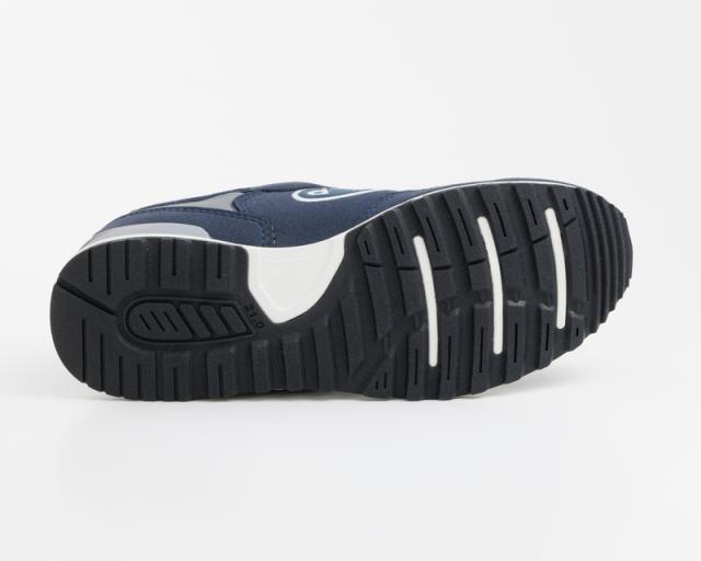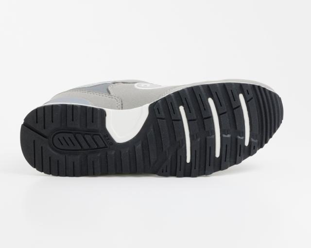 アッパー素材はメッシュ仕様で通気性を確保しました。 かかと側に配置された硬質パーツが着地時の安定性を向上させます。