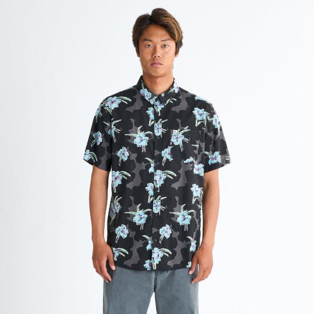 ボードショーツのシーズングラフィックとリンクした総柄半袖シャツ。