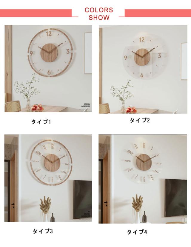 | 【透明な壁掛け時計】【直径30cm】【選べる6タイプ】 木製の針と、曲木のシンプルなフレームが上質感と温もりを感じさせる掛け時計。 北欧テイストでおしゃれな壁掛け時計で、木の温もりが感じられます。 文字盤は背面が透けて見えるのでインテリアによって様々な印象を与えます。 木製のシンプルなデザインなので、大人や子どもを問わずリビングはもちろん、寝室や子供部屋にもおすすめです! どこかレトロでアンティークな感じがかわいいです。 針は音がしない「静音タイプ」を採用し、気になるカチカチ音もありません。 引っ越しお祝い、誕生日、結婚、新築祝いなどのプレゼントにもおすすめな時計です! | |