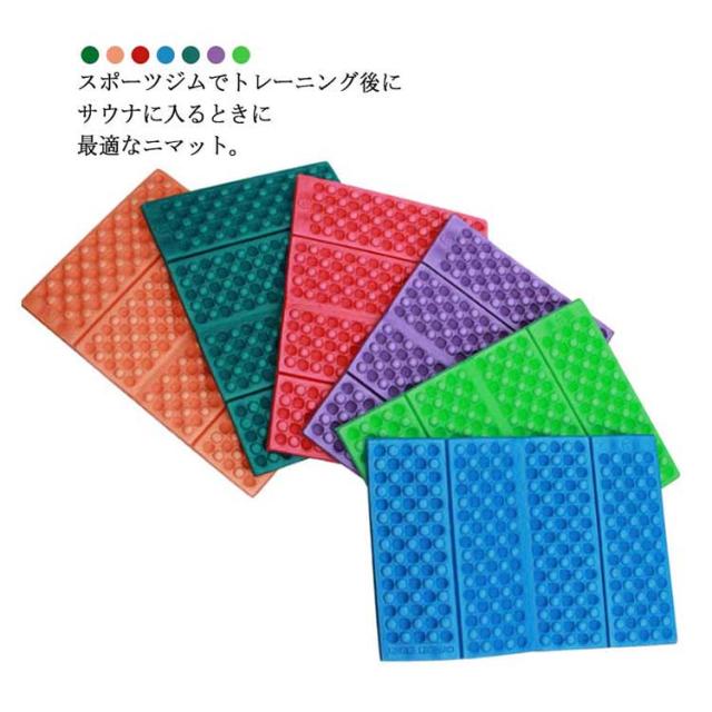 | スポーツジムでトレーニング後にサウナに入るときに最適なミニマット。 小さく折りたためるので、持ち運ぶのに大変便利です。 やわらかい厚肉なのでお尻が痛くならない。 かさが低いのに、クッション性があるのでお出かけに役立ちます。 使用後は水で洗い流し帰宅後に外に干して風に当てて乾かします。 | |
