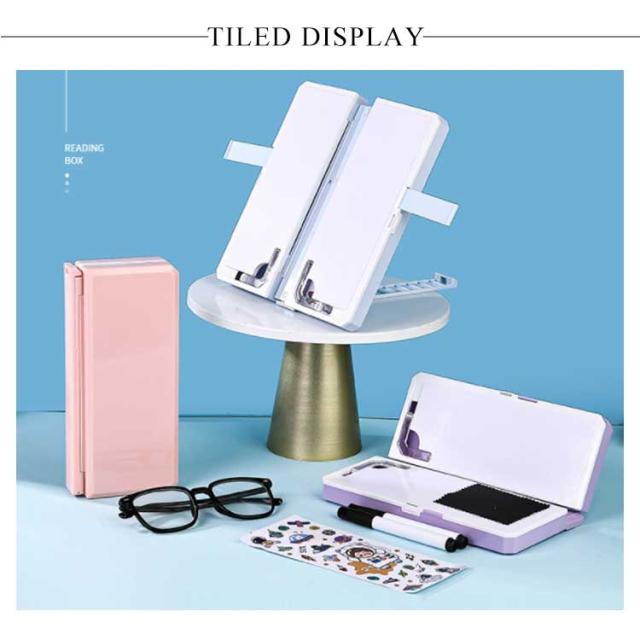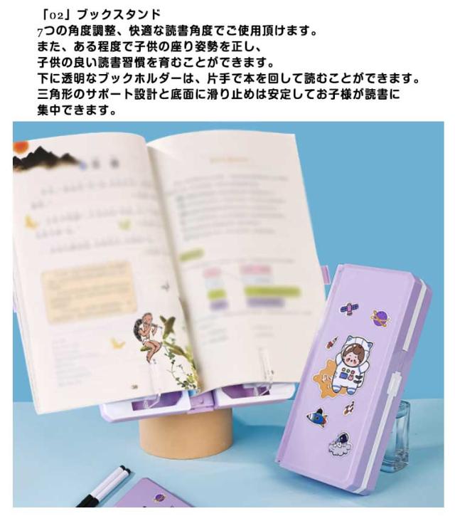 | 「01」筆箱 ペンケースは両側から開くことができ、文房具がはっきりと見えるので、取りやすくなります。また、さまざまなタイプの文房具を別の場所に置くことができるので、収納に便利です。中央部は収納スペースが大きく、あまり使わない文房具を大量に収納することができます。 「02」ブックスタンド 7つの角度調整、快適な読書角度でご使用頂けます。また、ある程度で子供の座り姿勢を正し、子供の良い読書習慣を育むことができます。 下に透明なブックホルダーは、片手で本を回して読むことができます。三角形のサポート設計と底面に滑り止めは安定してお子様が読書に集中できます。 「03」書き込みボード 書き込みボードを使うことにより、クラスの課題、落書きの計算、およびメモ取り中にいつでも記録することができます。ギフト用の装飾ステッカーは、自由にDIYして自分なりの筆箱を作ることができます。 一体型の隠し折りたたみ式デザインで、収納に便利で持ち運びが簡単で、どこでも使用できます。 アウトドア活動では簡単に折りたたんでバックパックに収納することができ、使用しないときは場所を取らずに保管できます。 家庭、学校、オフィス、図書館、リビングなどに適しています。 | |