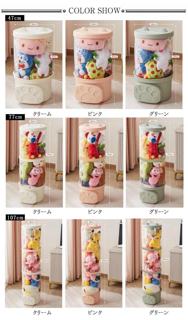 | サイズについての説明 | 47cm 直径約26 高さ47cm 約20個収納 77cm 直径約26 高さ77cm 約30個収納 107cm 直径約26 高さ107cm 約50個収納 収納個数はあくまで目安です、ぬいぐるみのサイズや形状などによって収納可能数量も異なります。 ※サイズ表の実寸法は商品によって1-3cm程度の誤差がある場合がございます。 |