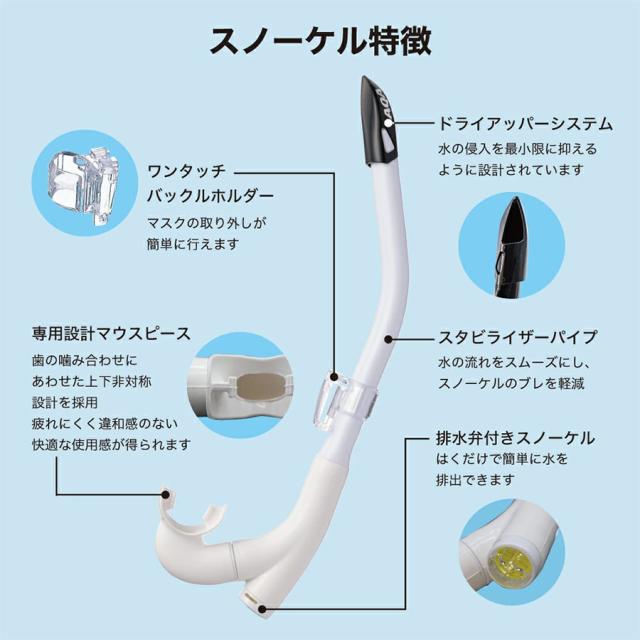 ワンタッチバックルホルダー:AQA 初採用。マスクとスノーケルの取り外しが簡単に行えます。