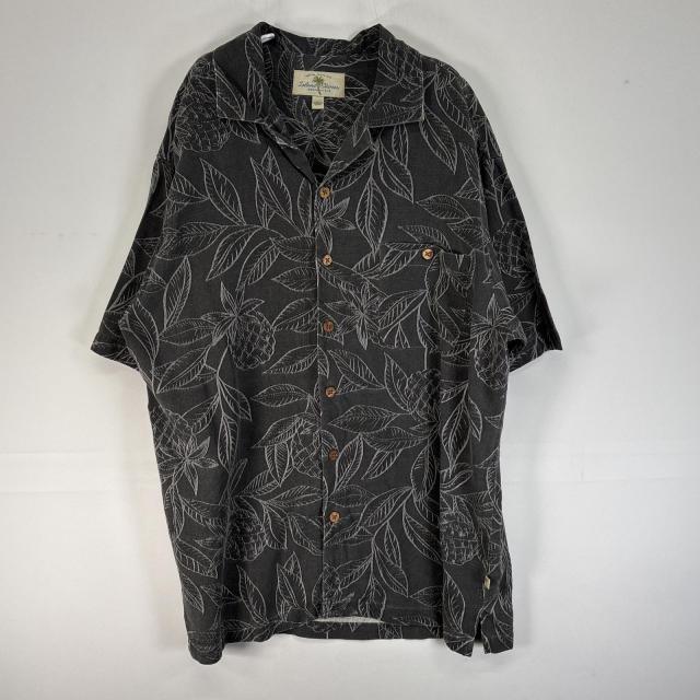 古着 Island Shores 半袖シャツ アロハ シルク 植物 オープンカラー L ダークグレー 総柄 メンズ