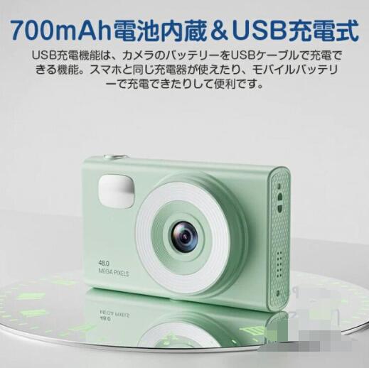 操作しやすく持ち運びやすいミニカメラサイズで、簡単にポケットに入れて、持ち運びやすいです。また、700mAh電池内蔵&USB充電式、カメラのバッテリーをUSBケーブルで充電できる機能。スマホと同じ充電器が使えたり、モバイルバッテリーで充電できたりして便利です。