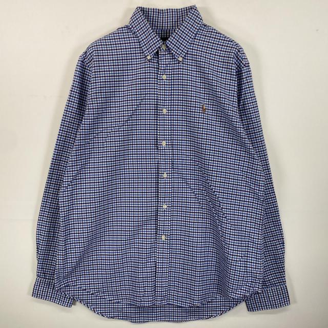 古着 ラルフローレン RALPH LAUREN 長袖シャツ ボタンダウン ワンポイントロゴ刺繍 L ブルー系 チェック メンズ