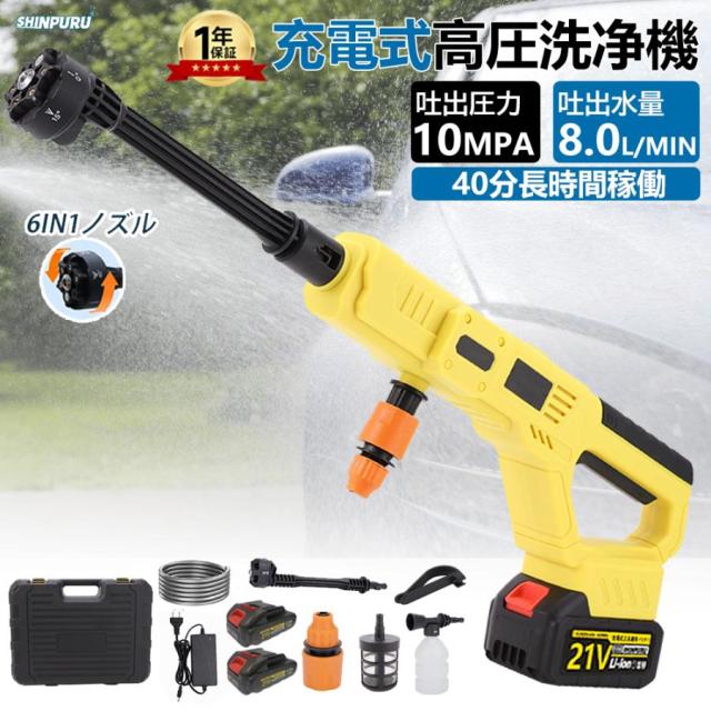 高圧洗浄機本体 x 1、給水フィルターx 1、6 in 1 ノズル x 1、フォームノズル x 1、延長ポール x 1、5m給水ホースx 1、日本語取扱説明書x 1、収納ボックスx 1、本体側力ップリング。充電式コードレス高圧洗浄機に関するいかなる質問がございましたら、ぜひご遠慮なく弊店に連絡してください。