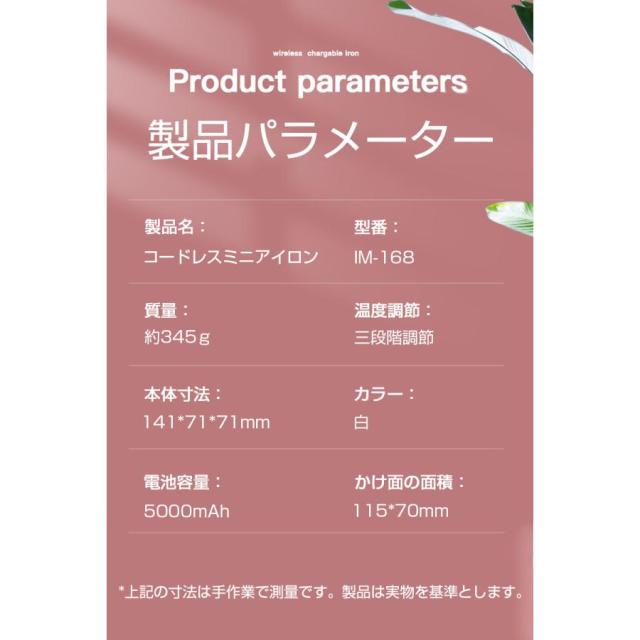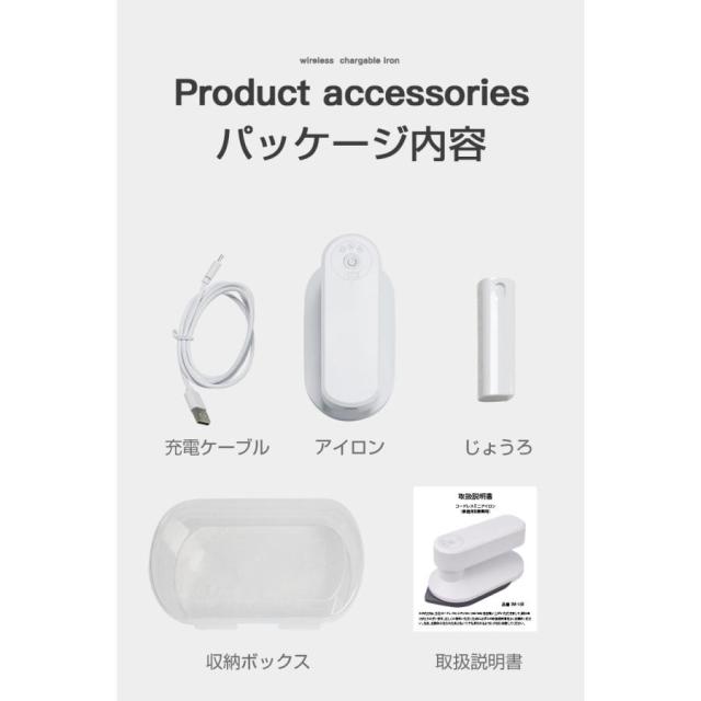【パッケージリスト】アイロン本体*1、充電ケーブル*1、スプレー*1、日本語取扱説明書*1、収納ボックス*1