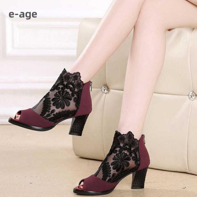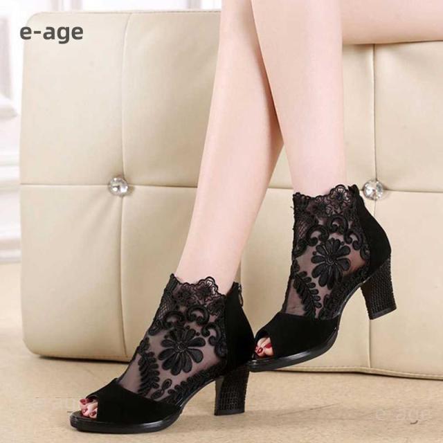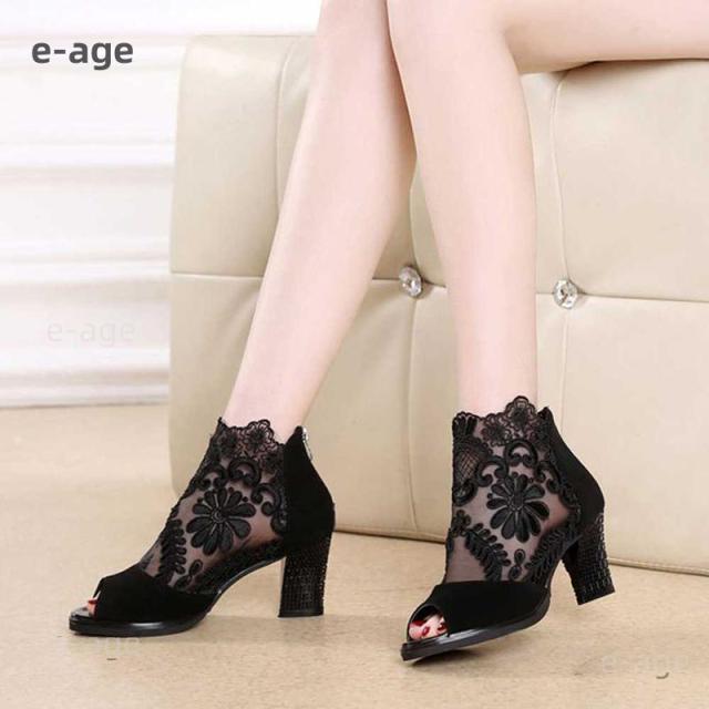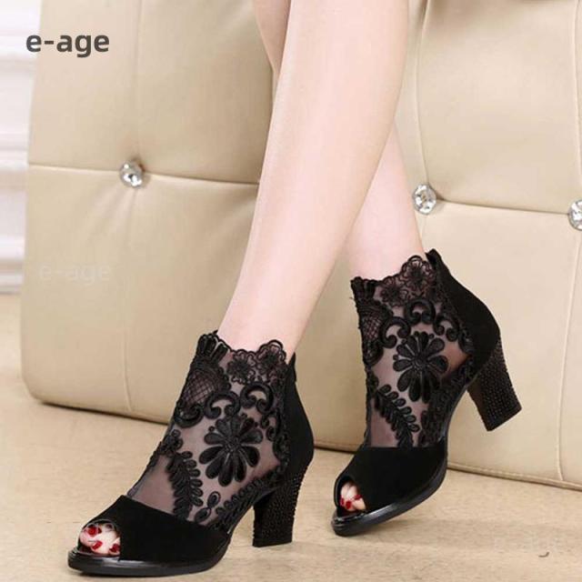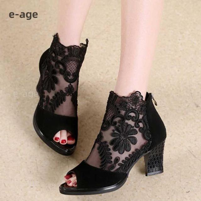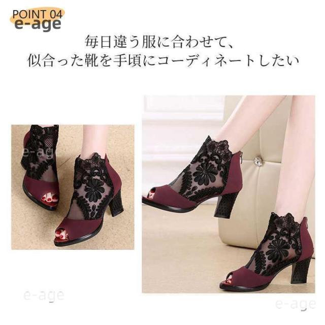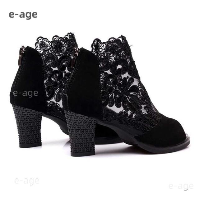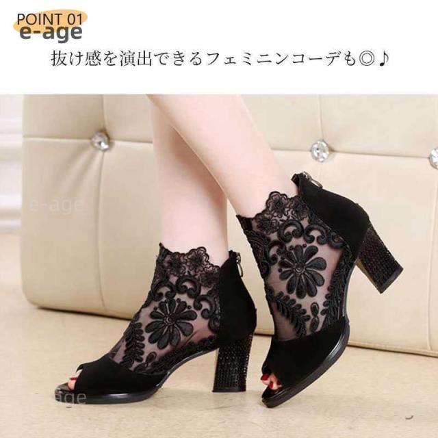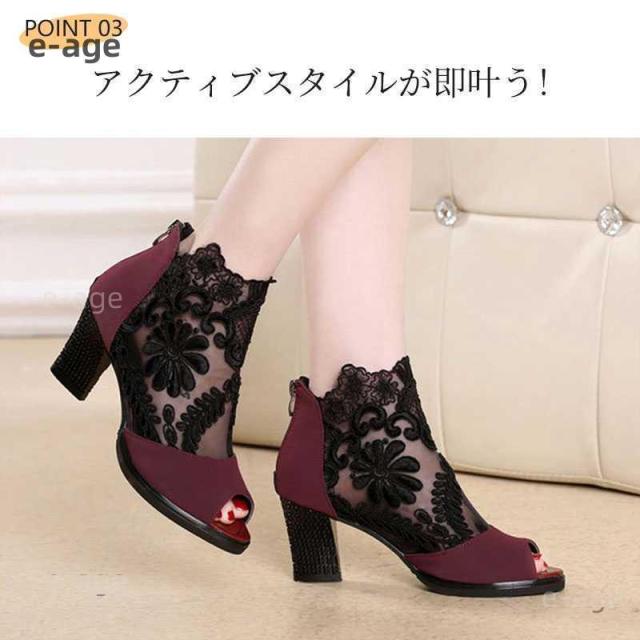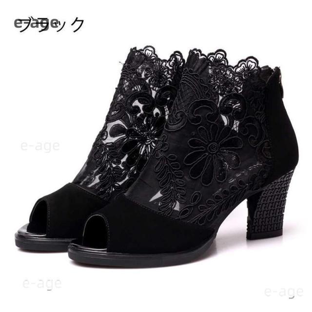 サマーブーツ レディース ブーツサンダル レース ブーティ ブーツ メッシュレース 痛くない 靴 ヒール7cm 美脚サンダル 大きいサイズ 22.5~26.5cm