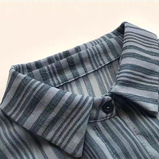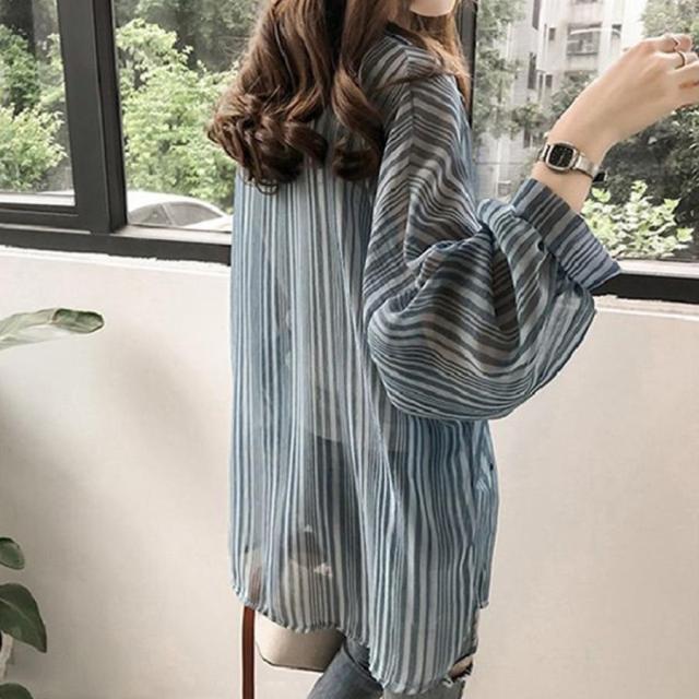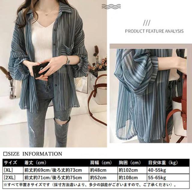 ストライプ ブラウス 大きいサイズ パフスリーブ UV対策 人気 オフィスカジュアル おしゃれ 着やせ OL シースルー