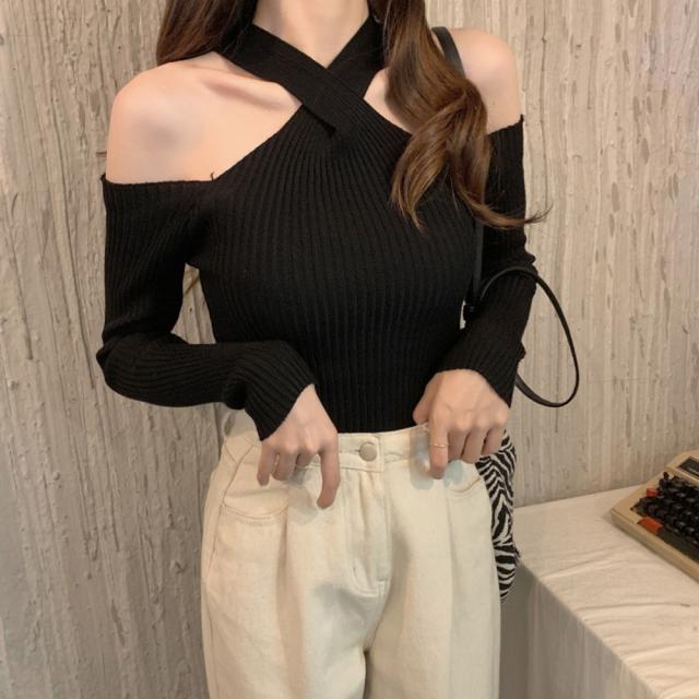 首元のクロスデザインに大胆な肩開きが大人っぽいニットトップス