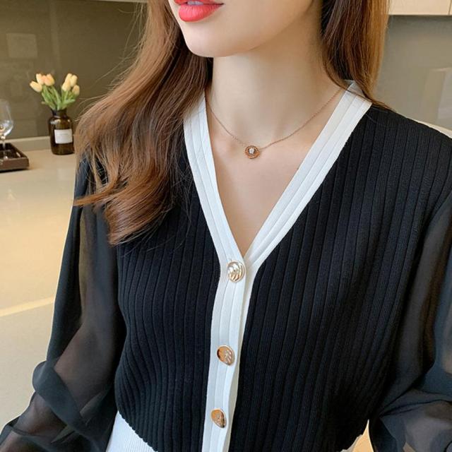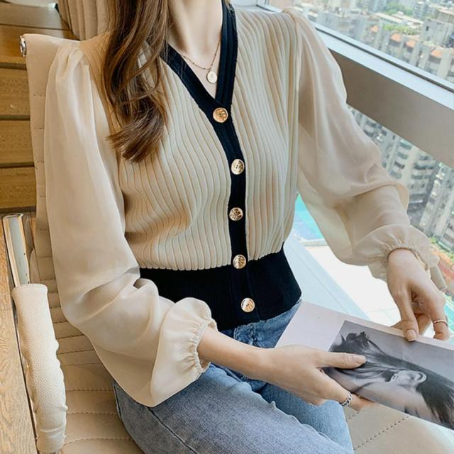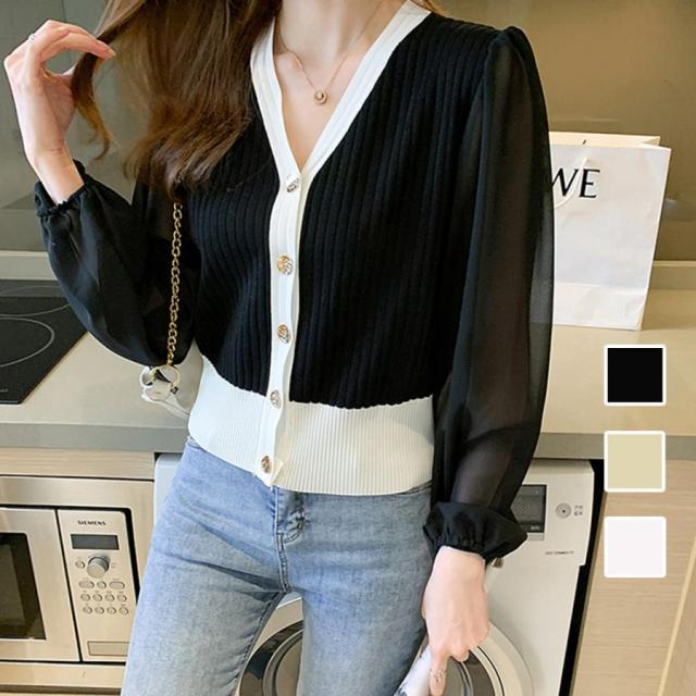 シフォンニット切り替え リブニット Vネック 女性 長袖 異素材ニットウェア ストレッチ シースルー 袖 ニットセーター