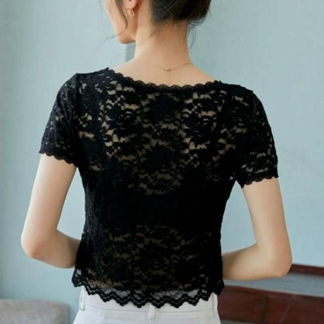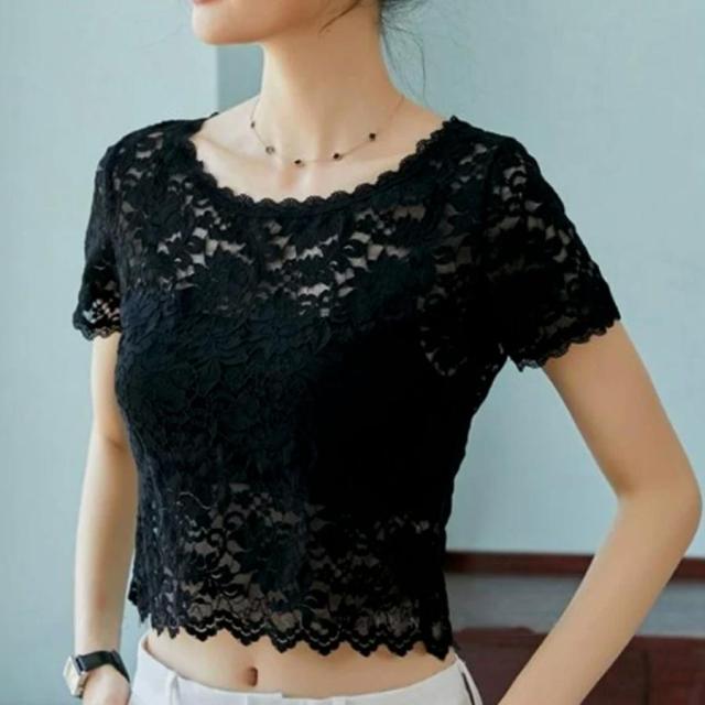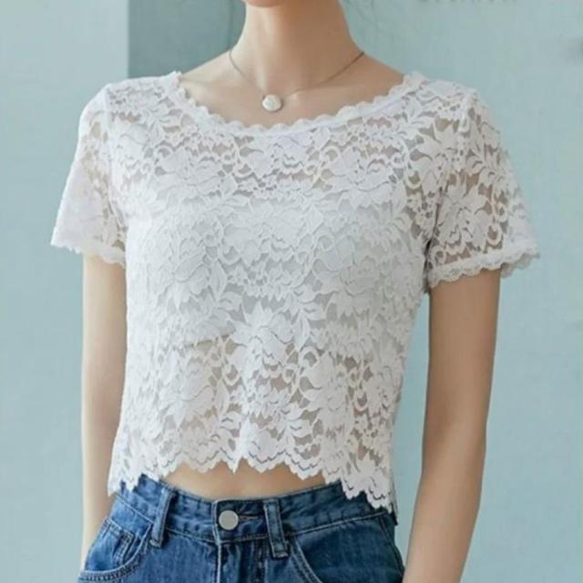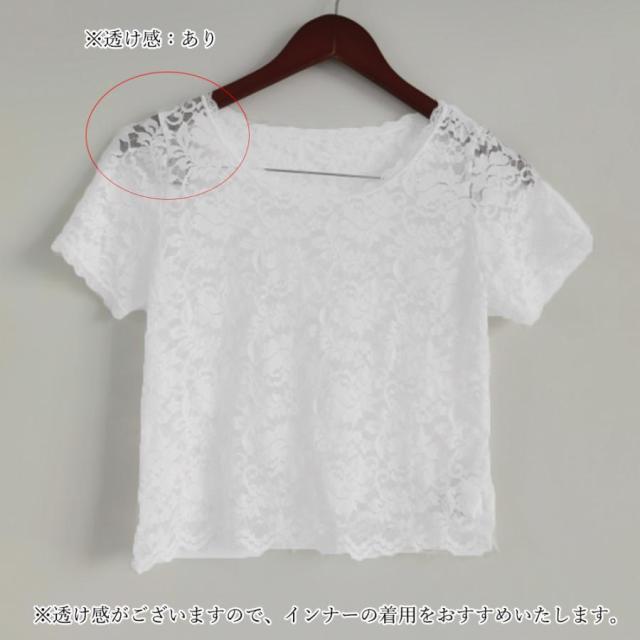 繊細なレース素材を使用、大人っぽくフェミニンに仕上げた半袖ブラウス