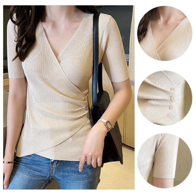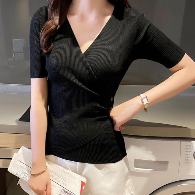 カシュクール風のVネックデザインでデコルテがキレイに見える