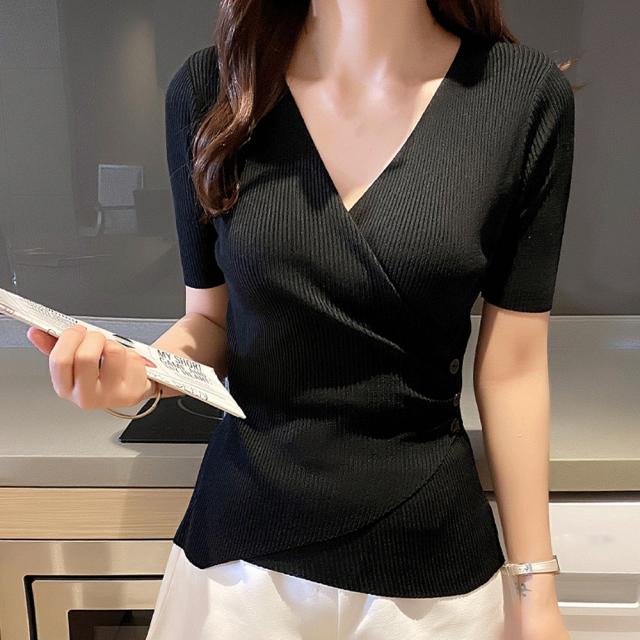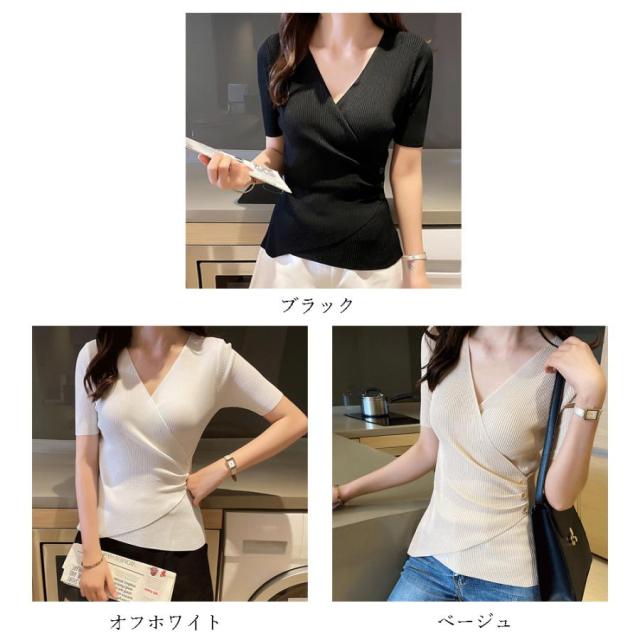 ニットソー ボダン セーター オフィス きれいめ 半袖 プルオーバー トップス