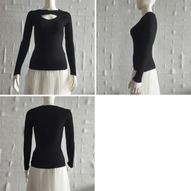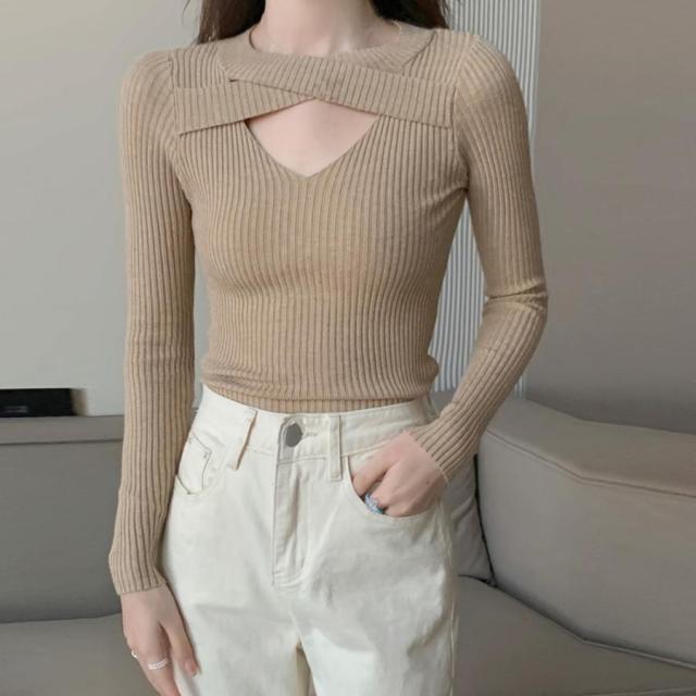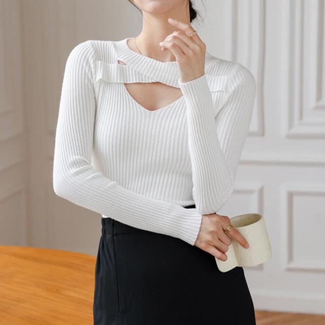 セクシーなフロントクロスと胸開きデザインのニットトップス