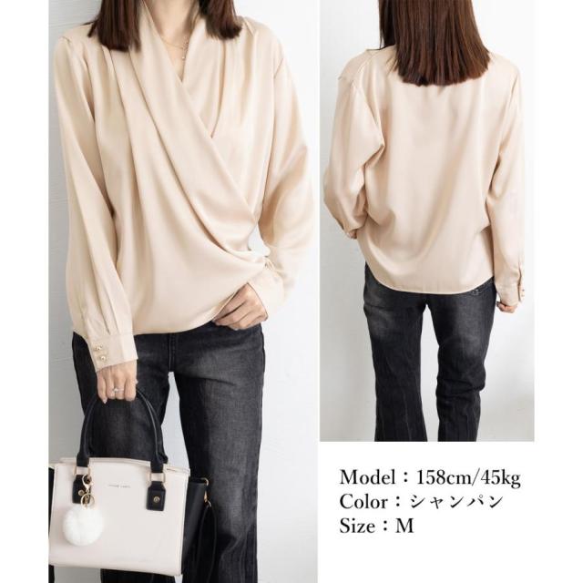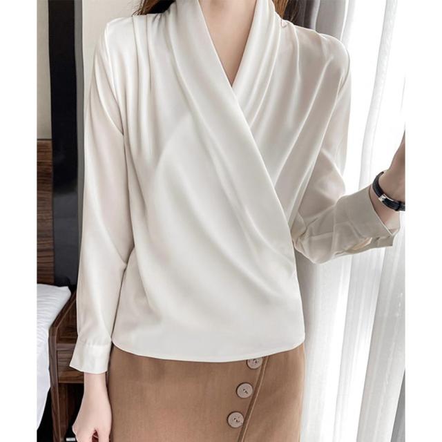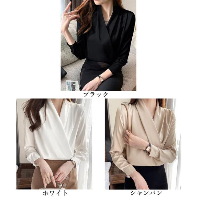 大人女性 サテン風とろみシャツ 通勤服Vネック オフィスカジュアル ドレープシャツ フェミニン 長袖シャツブラウス春夏秋
