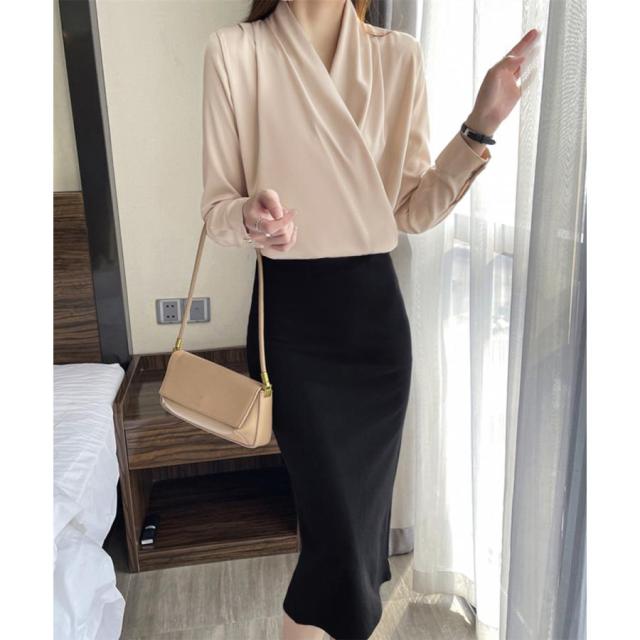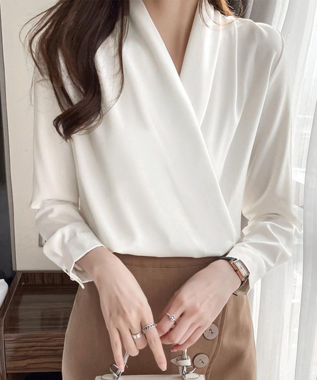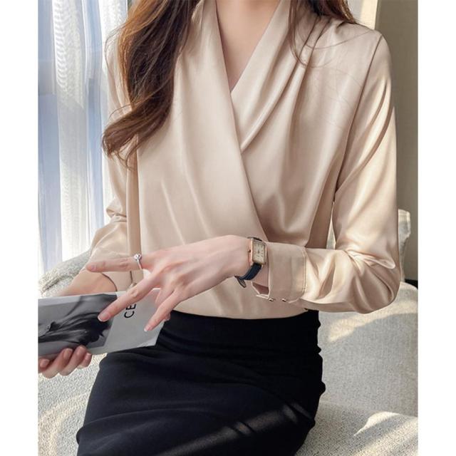 エレガントで洗練されたデザインのシルク風シャツブラウス