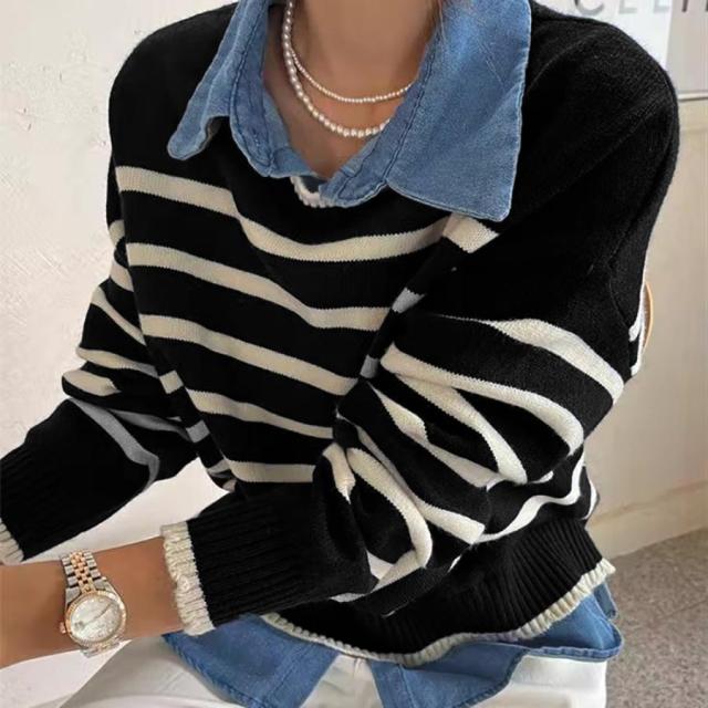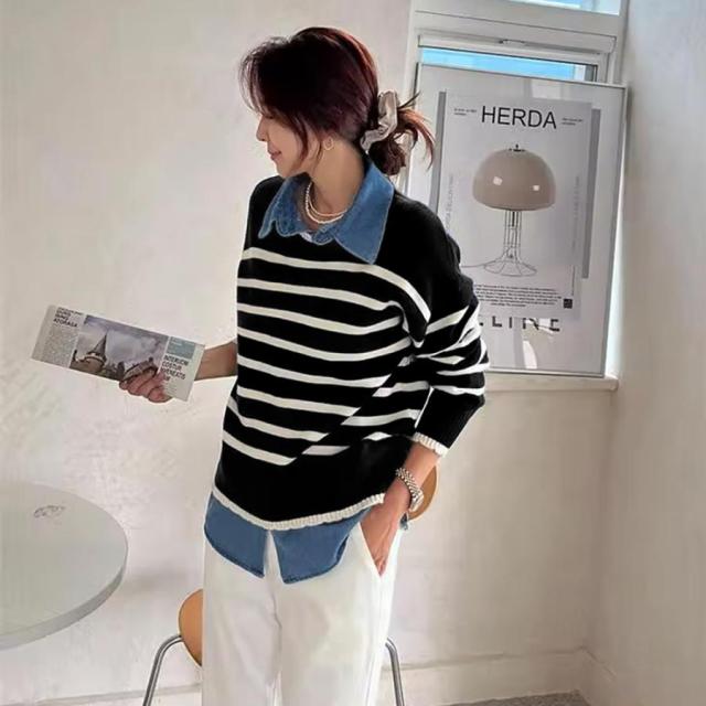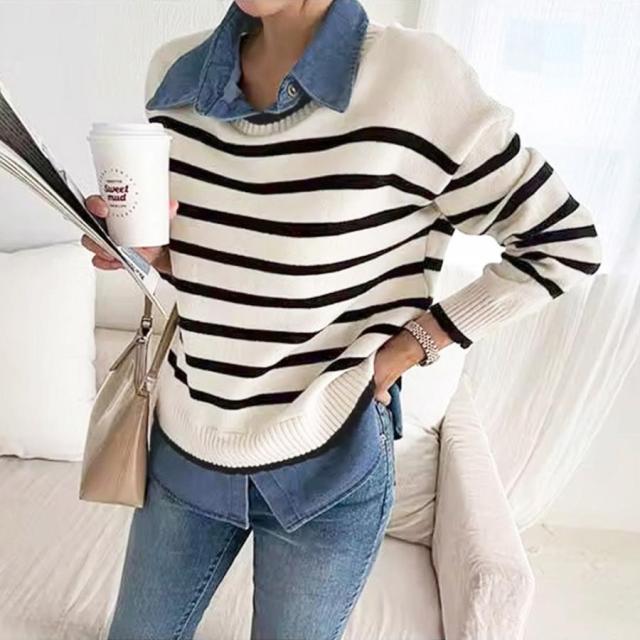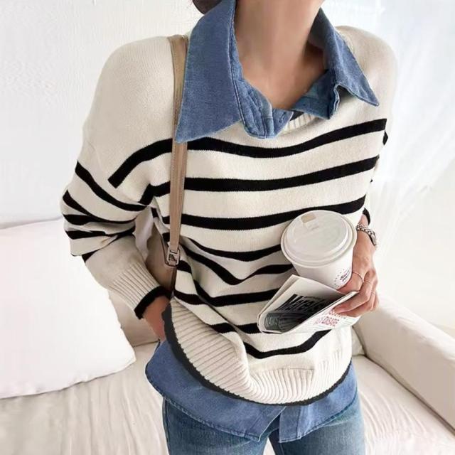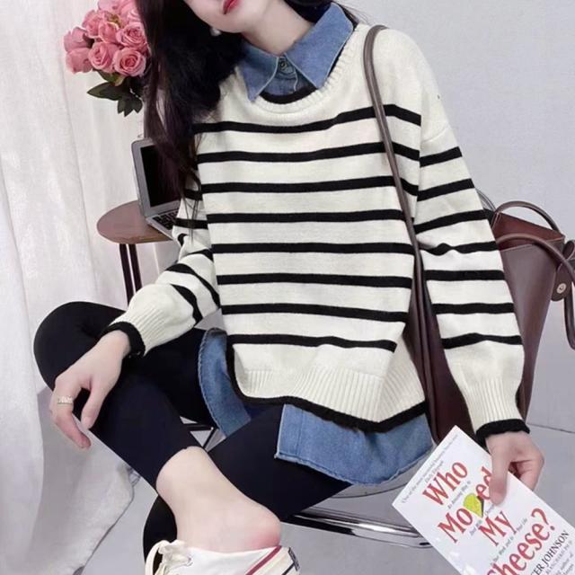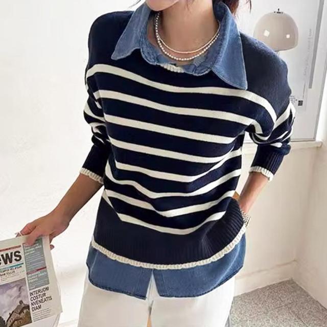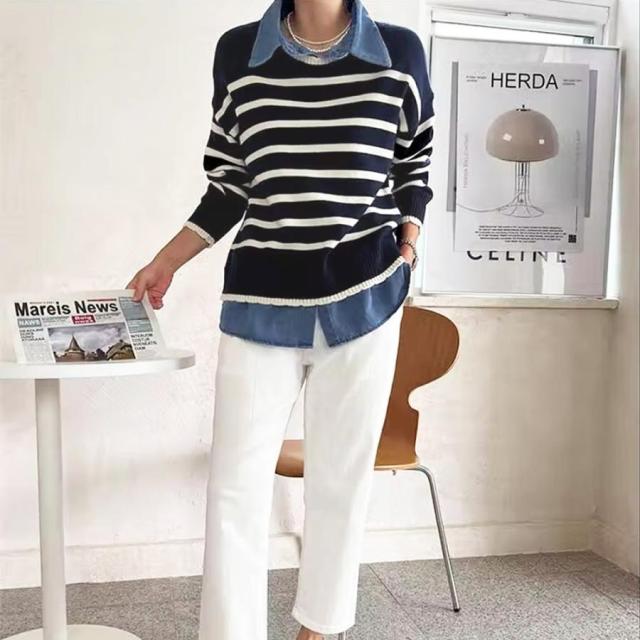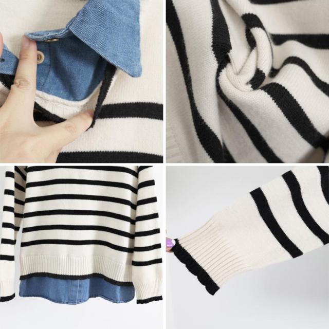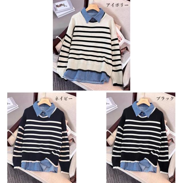 ボーダーニット デニムシャツ切り替え 長袖 レイヤード風トップス カジュアルきれいめ 体型カバー 秋冬トップス 重ね着風