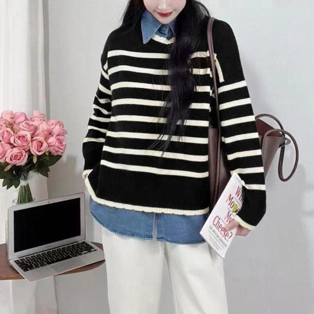 ボーダー柄ニット素材に重ね着風にドッキングした襟元と裾デザインがトレンド感満載のドロップショルダー切り替えトップス