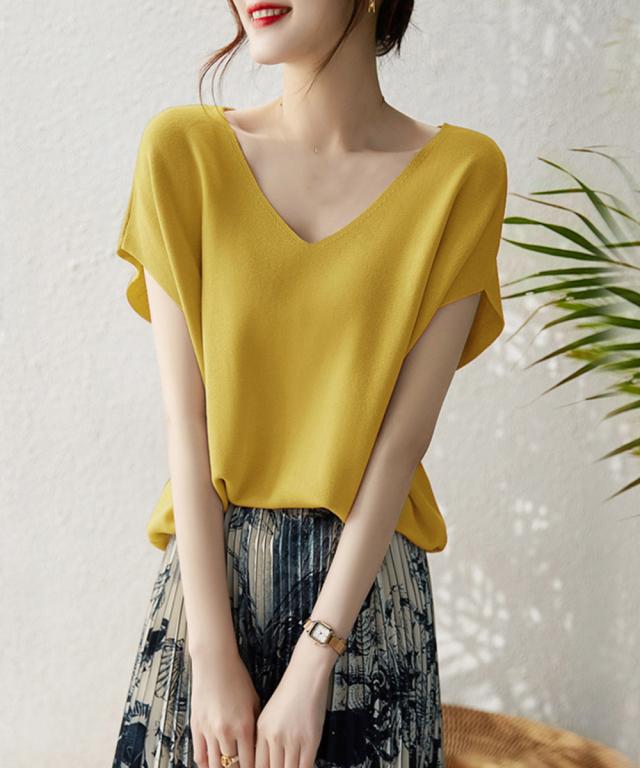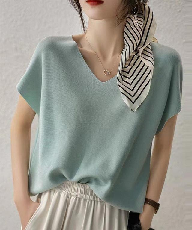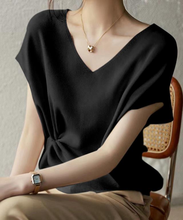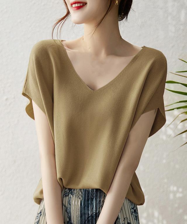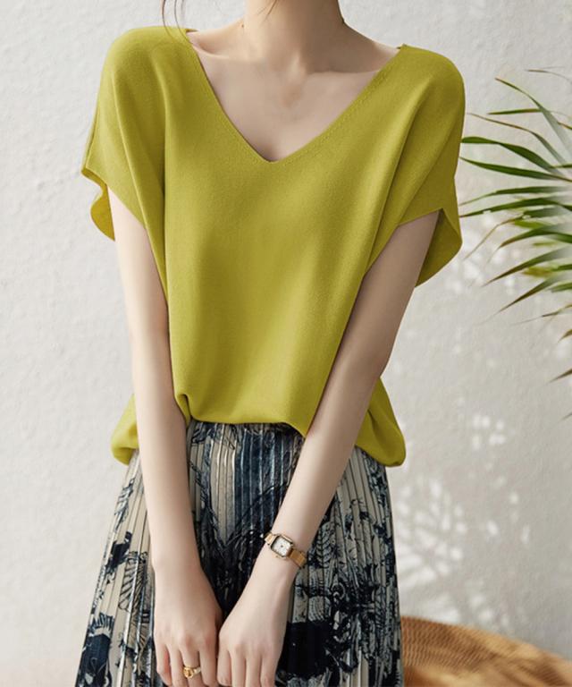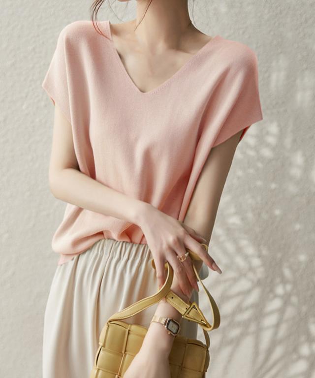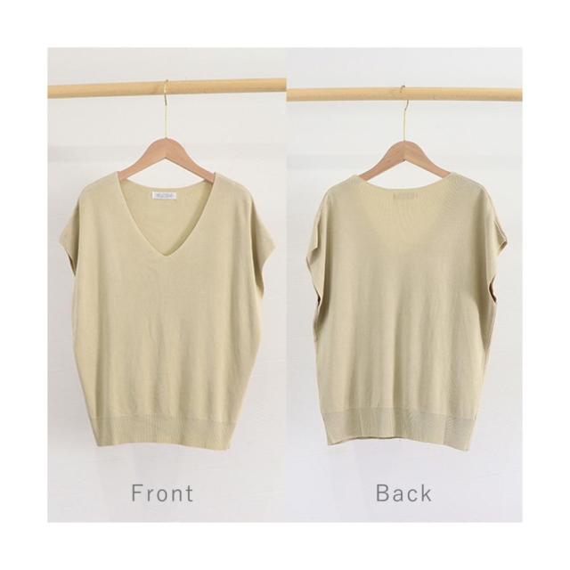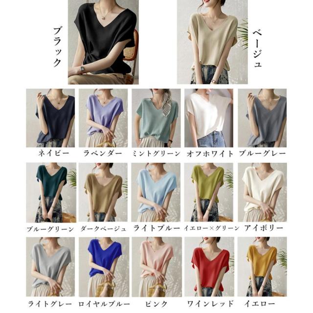 フレンチスリーブ ニットソー 体型カバー vネック 冷感タッチ 半袖 サマーニット きれいめ オフィスカジュアル 着やせ