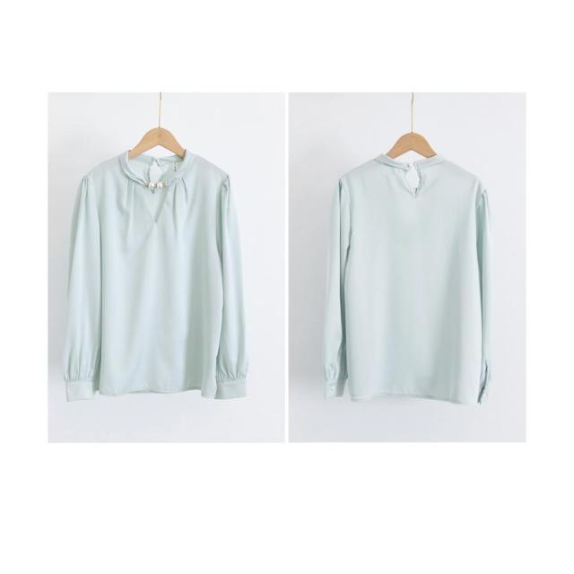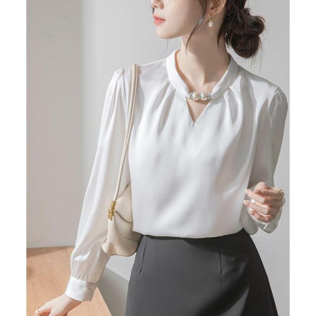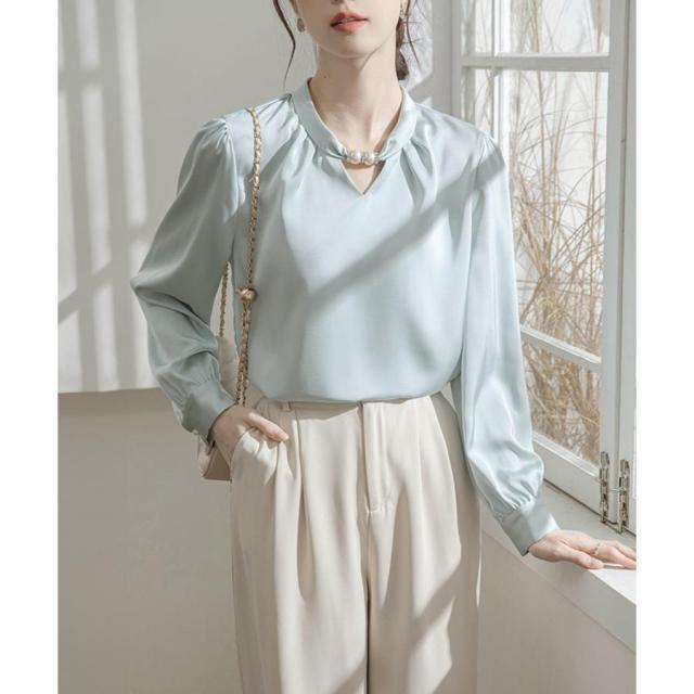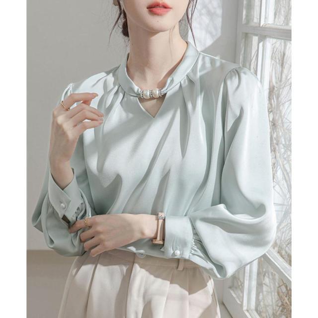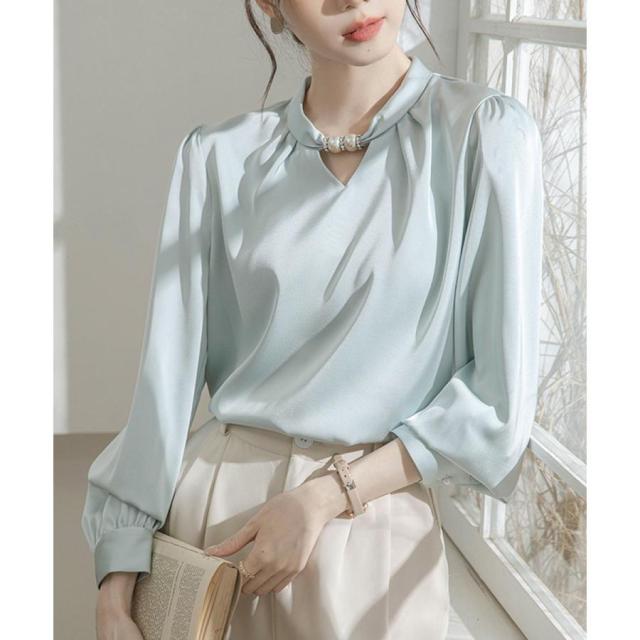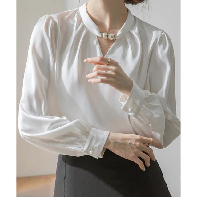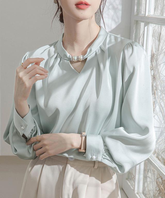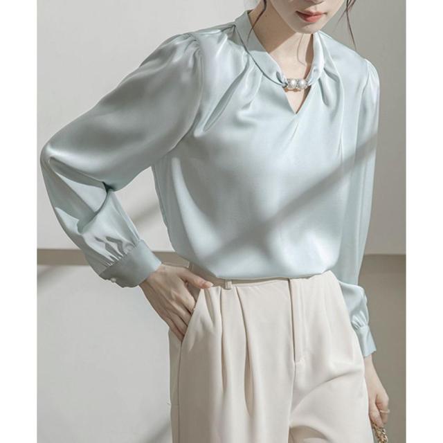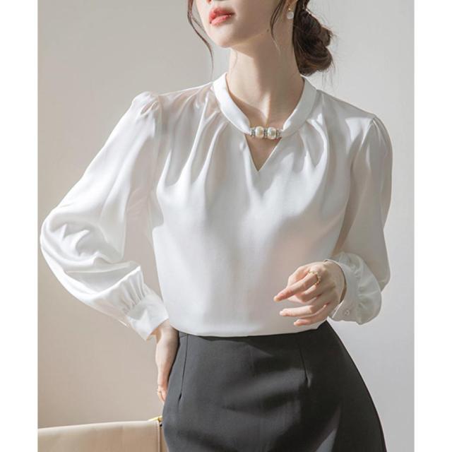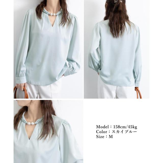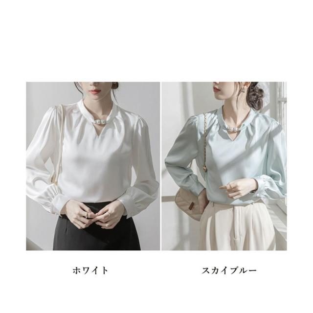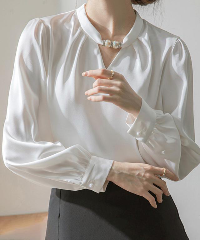 衿元のパール調飾りがポイントのエレガントな雰囲気のサテン風ブラウス