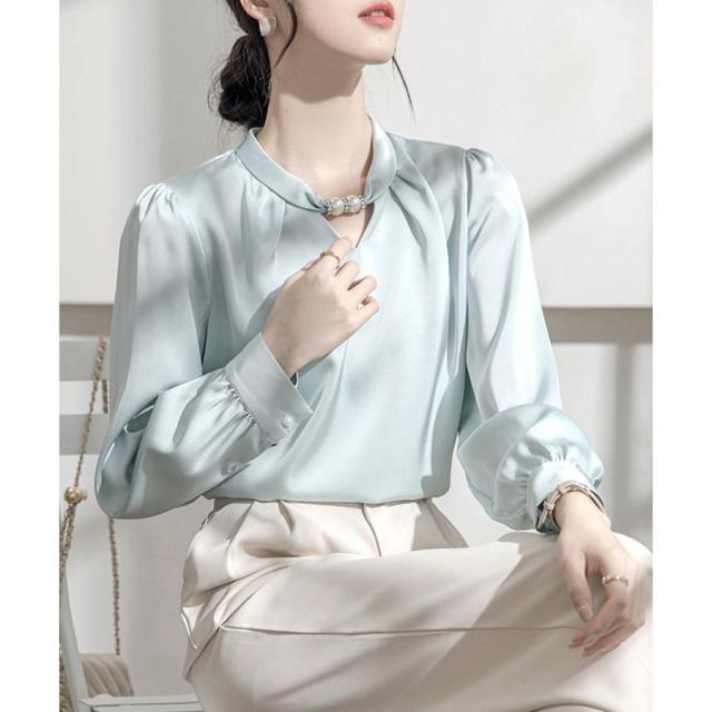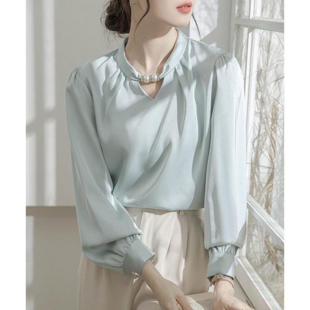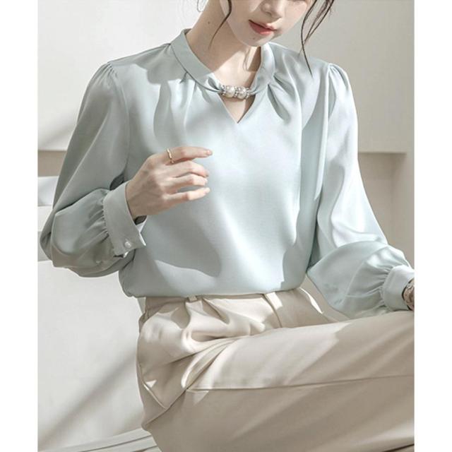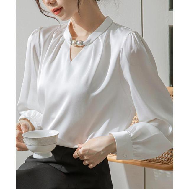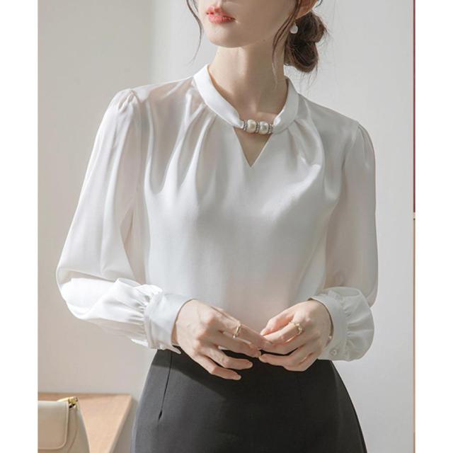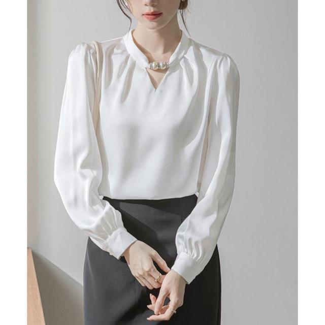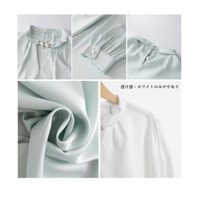 フォーマル スタンドカラーシャツブラウス 衿元パール オフィスワイシャツ 20代30代40代 通勤服長袖 大人上品春秋夏