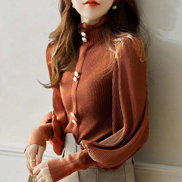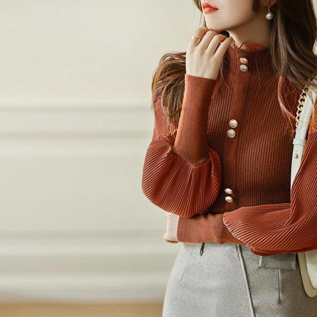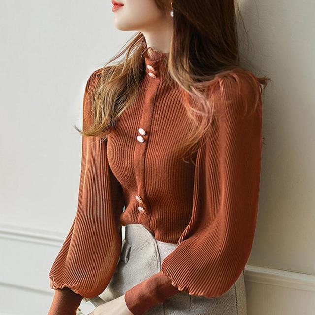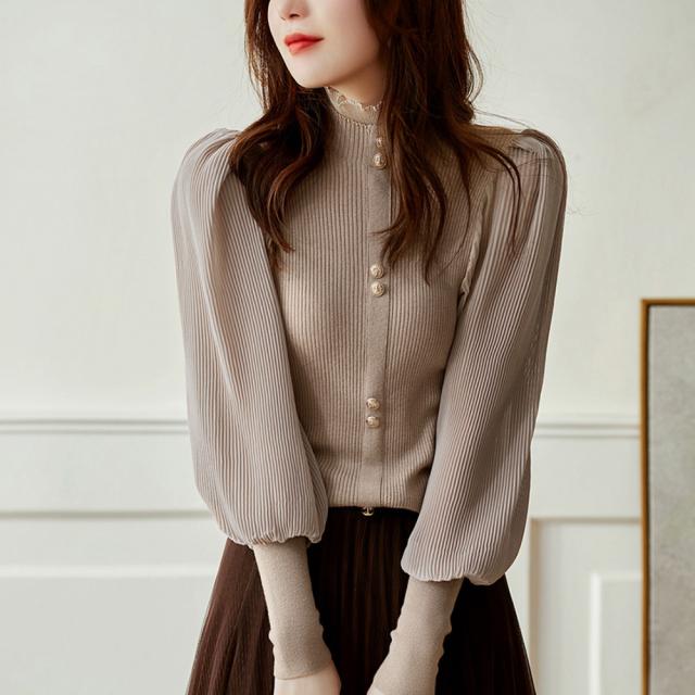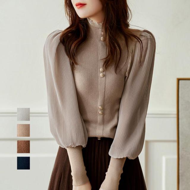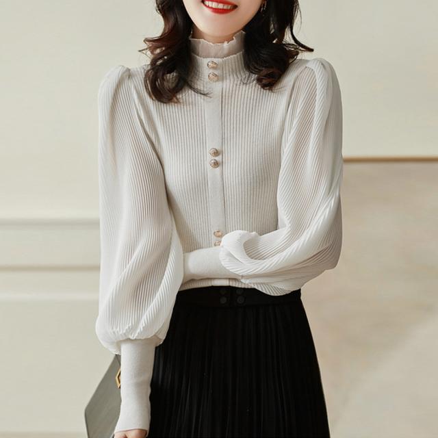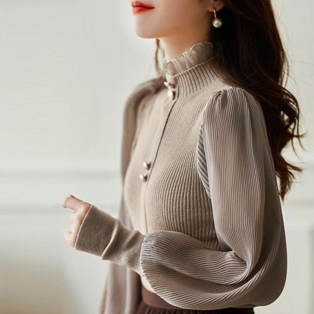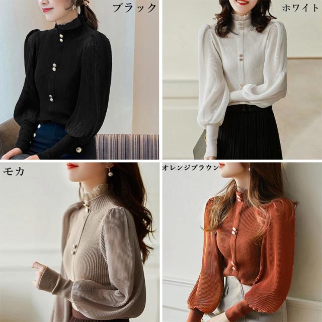 レディース 袖切り替え シフォンプリーツ ブラウス パフスリーブ ドッキングニット プチハイネック トップス 春秋冬