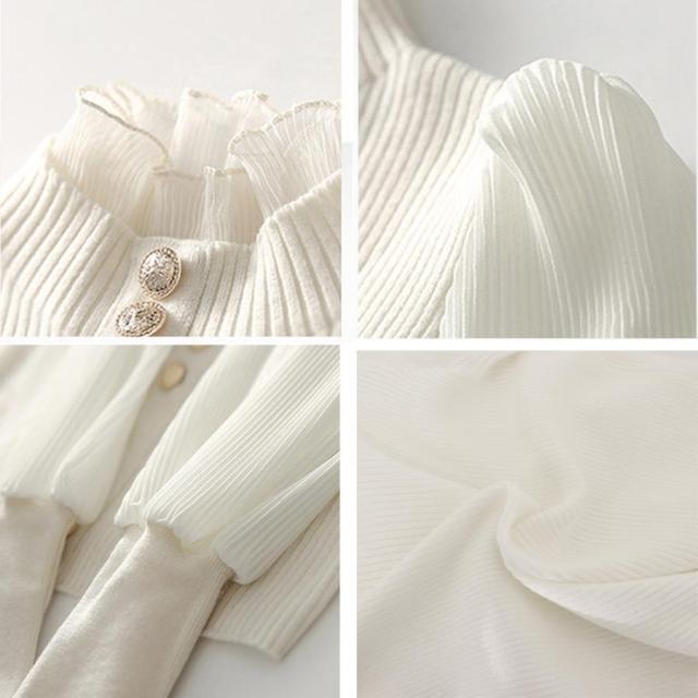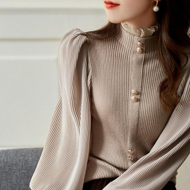 こなれ感が漂うリブニットとプリーツシフォンの異素材ドッキングDesignのフェミニントップス
