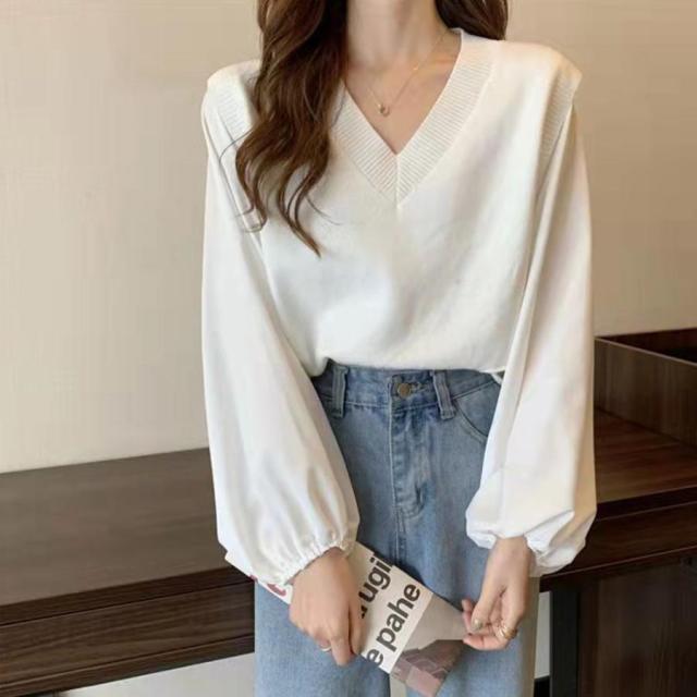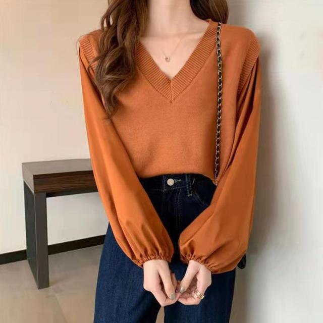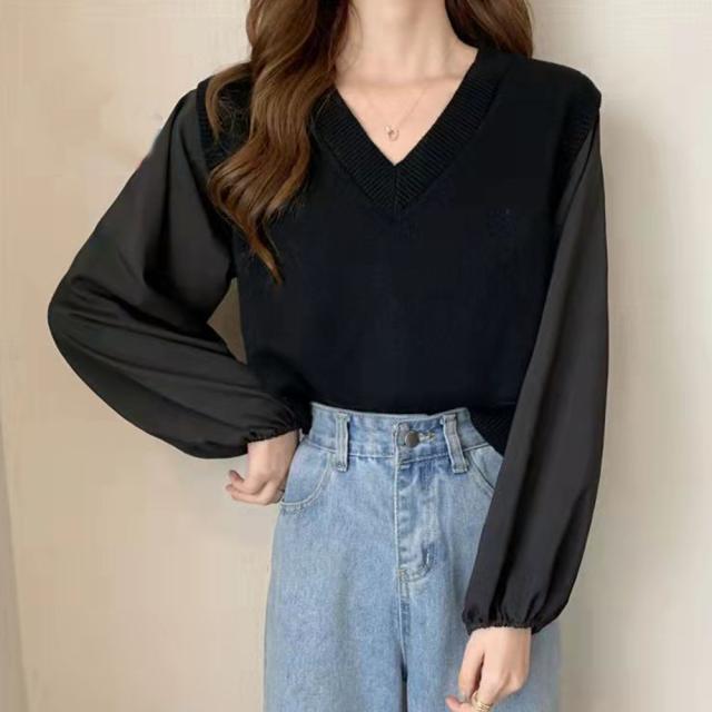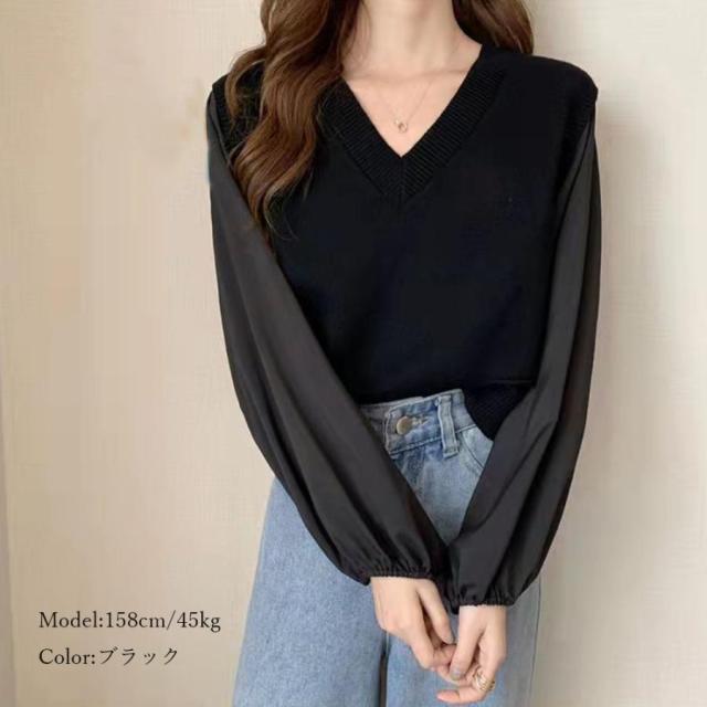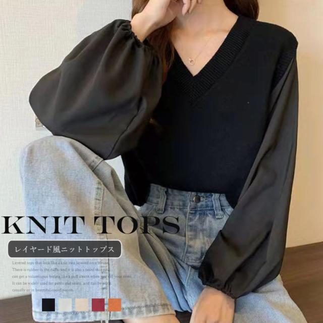 ニットセーター ボリュームスリーブ 重ね着風ニットソー お洒落 ショート丈 ドッキング ニットブラウス 無地