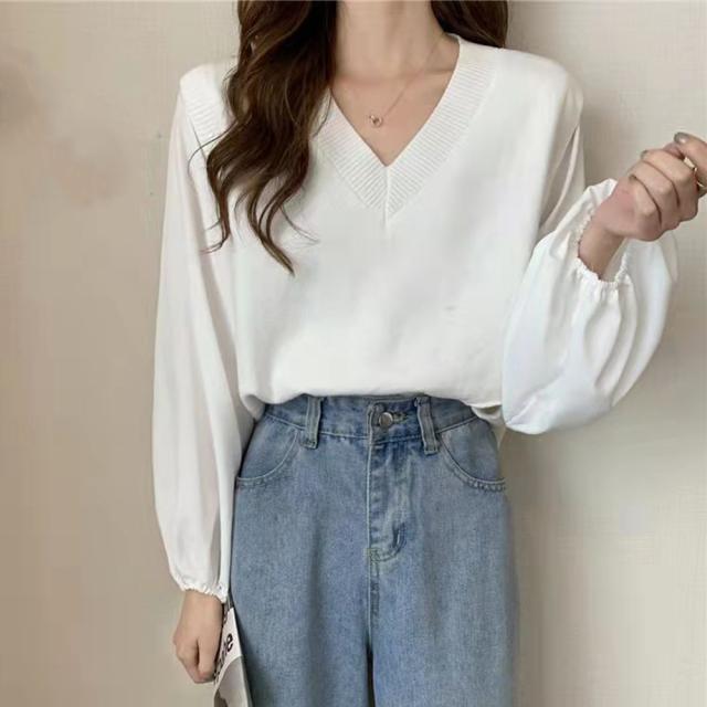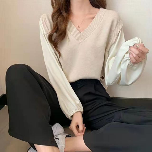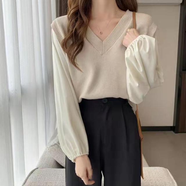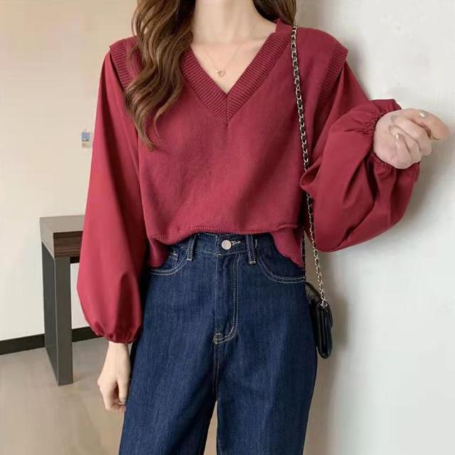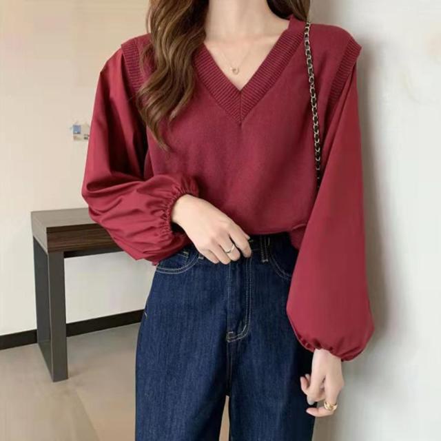 ブラウスにニットベストを重ねたようなレイヤード風のトップス