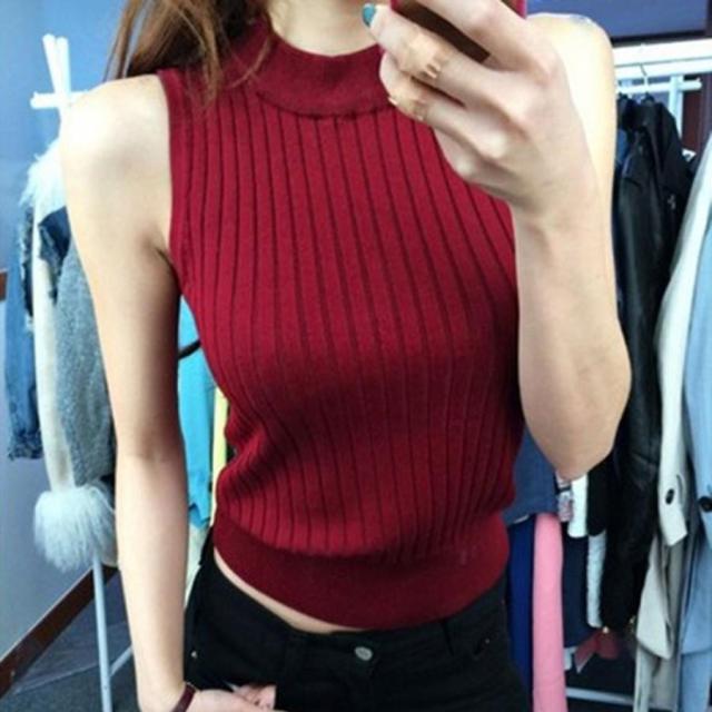 リブニット トップス レディース ショート丈 タンクトップ 春夏秋 ノースリーブ ニット タイトトップス ラウンドネック【ゆうパケット可】