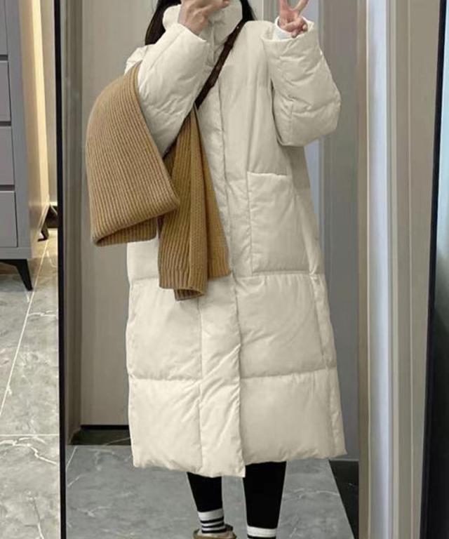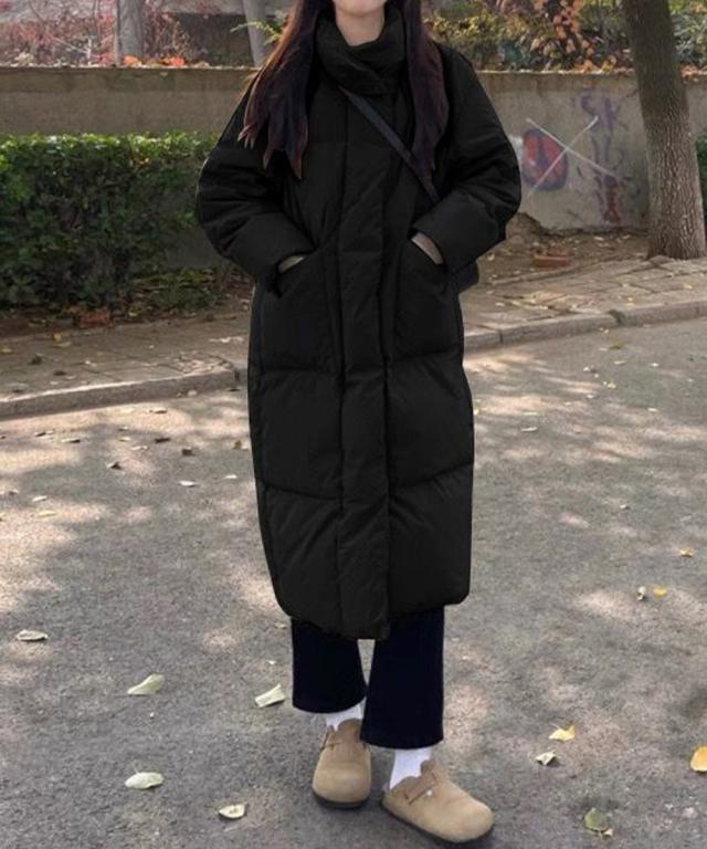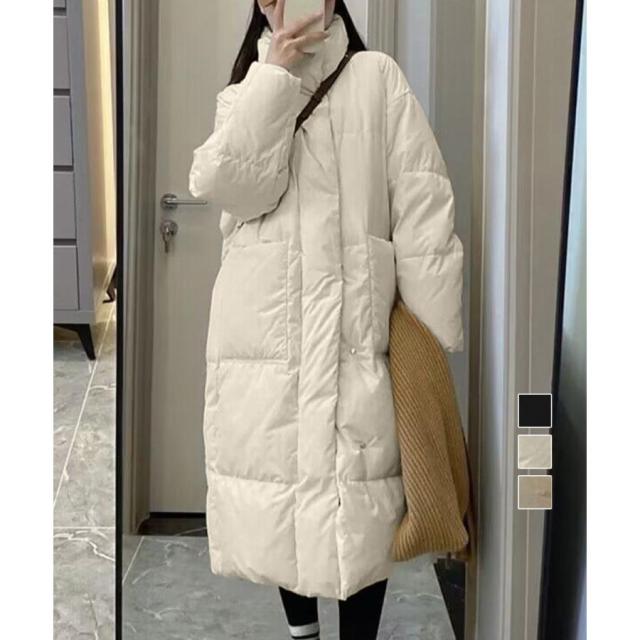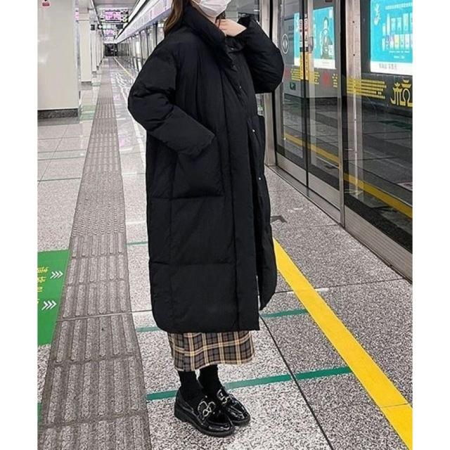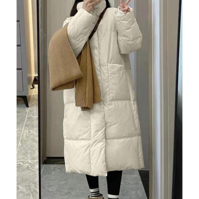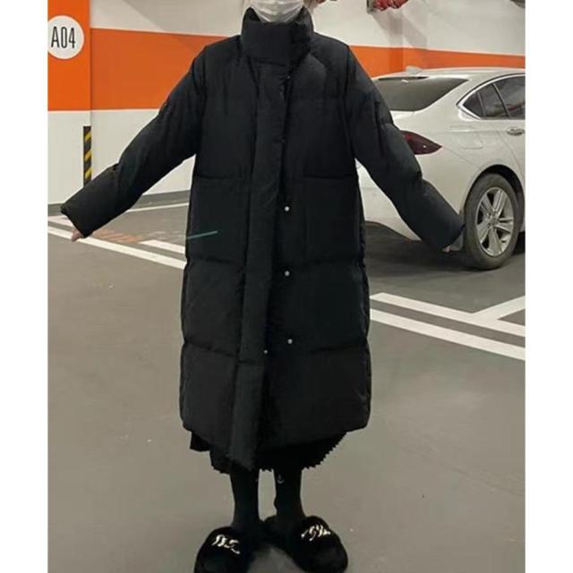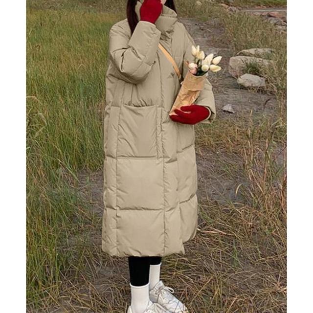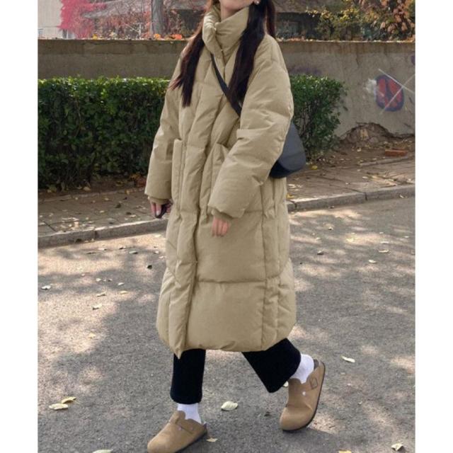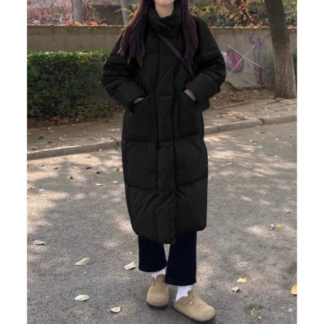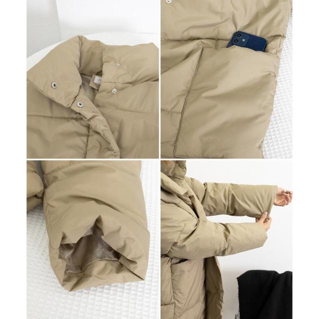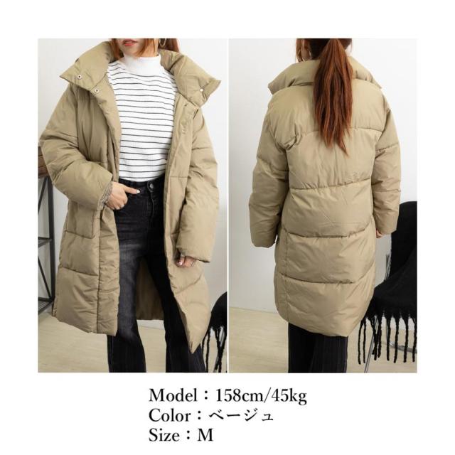 すっぽりハイネック付きで暖かく、ゆったりめのエコダウンロングコート。