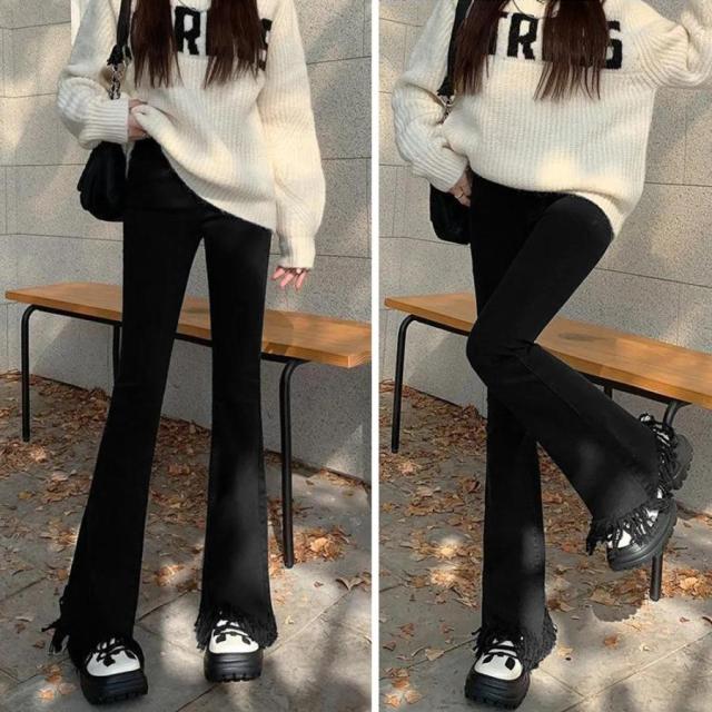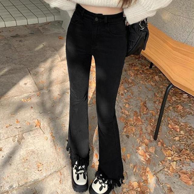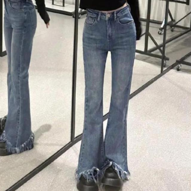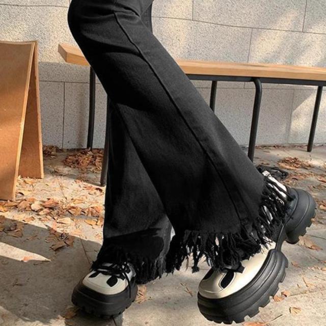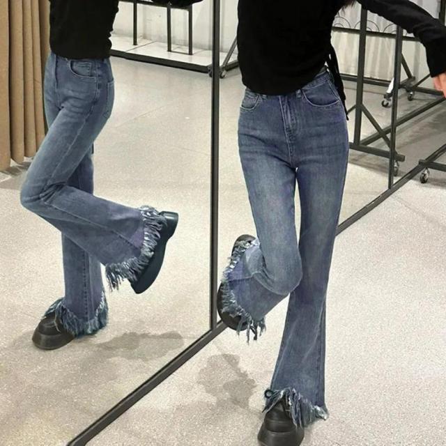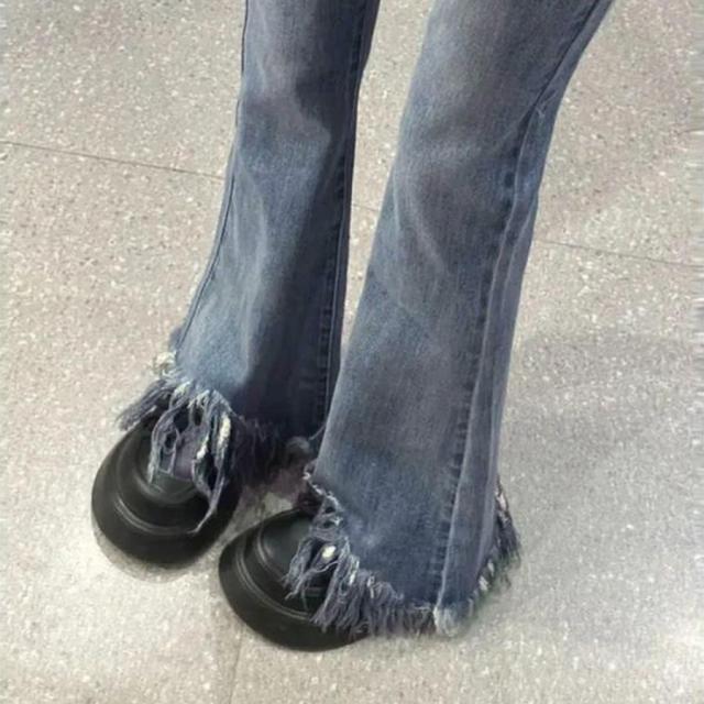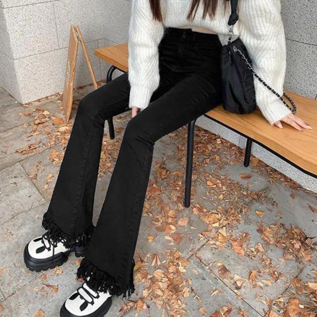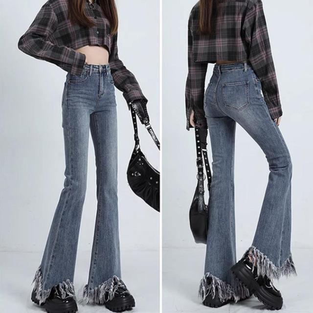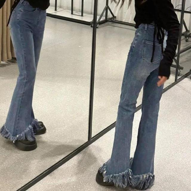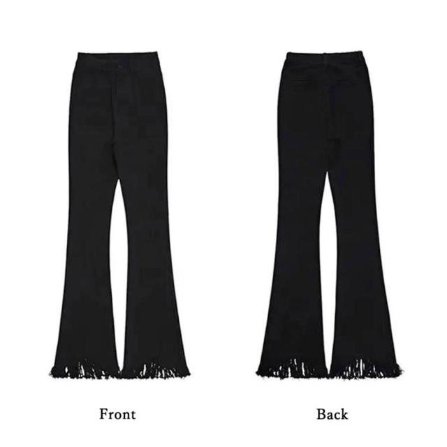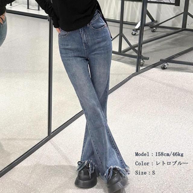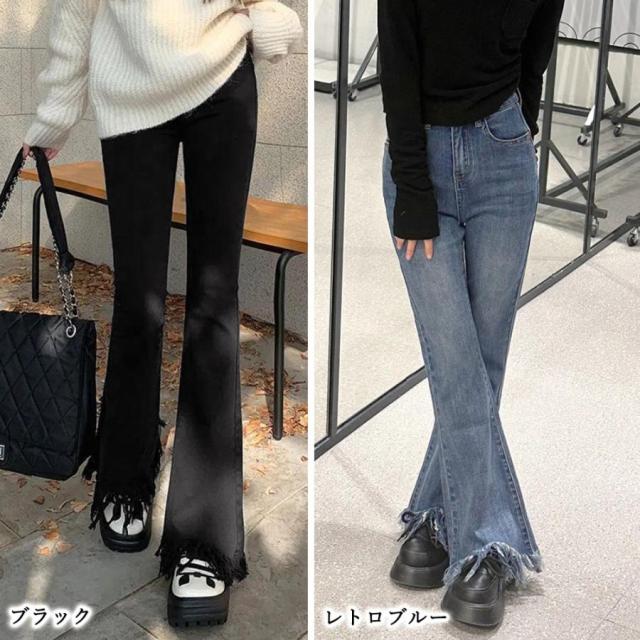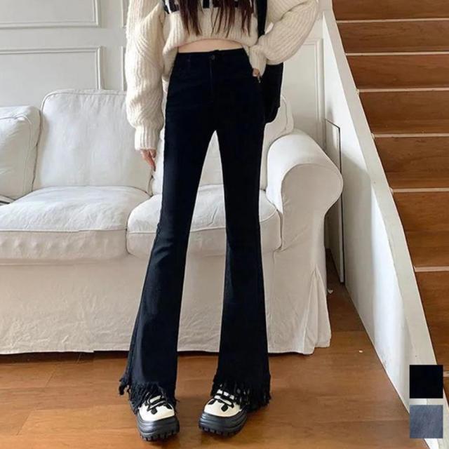 美脚を引き立てる魅力的な裾フリンジデニムフレアパンツ