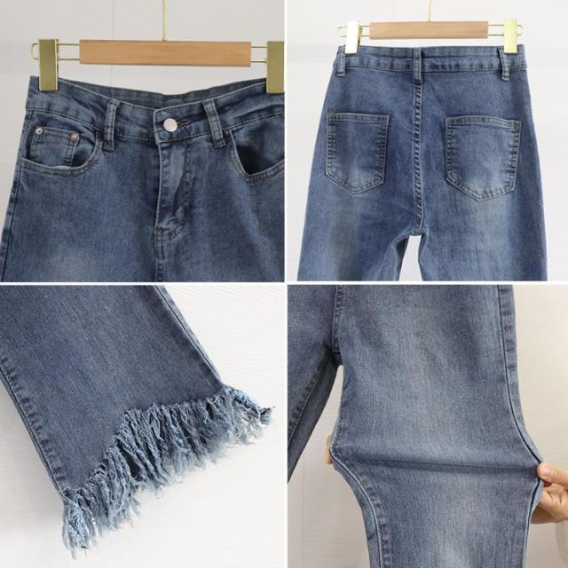 ハイウエスト スキニーデニムパンツ 着やせ カジュアル ロングパンツ おしゃれ 裾フリンジ ジーパン 細身 スリム 韓国
