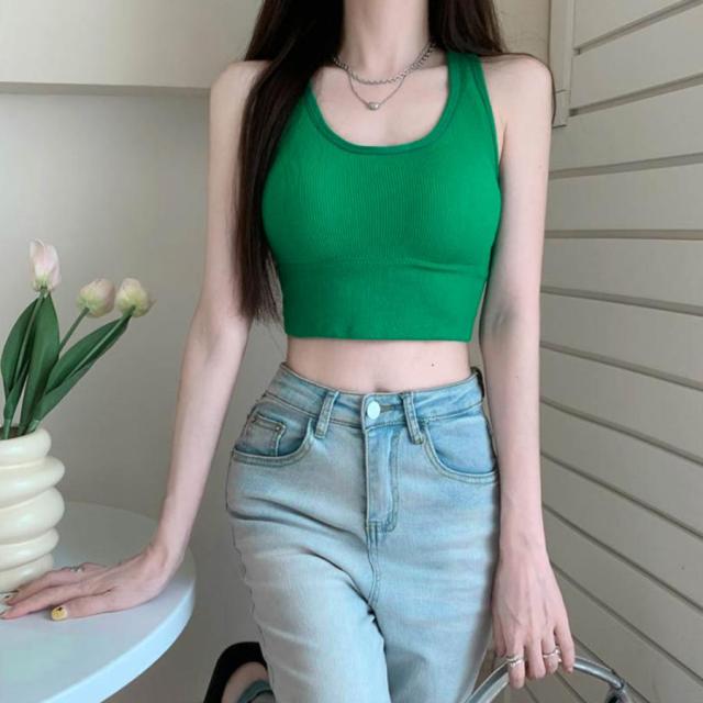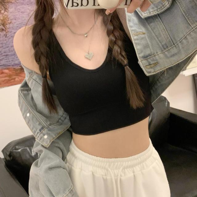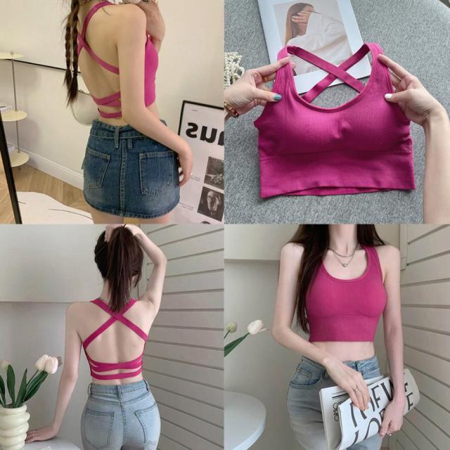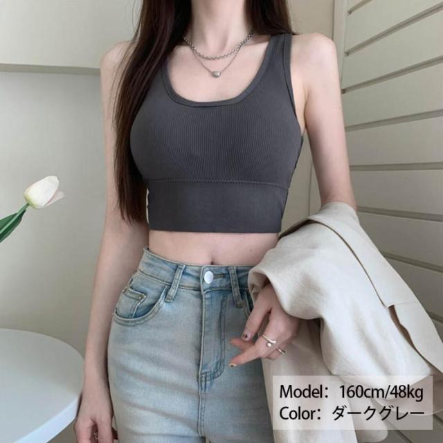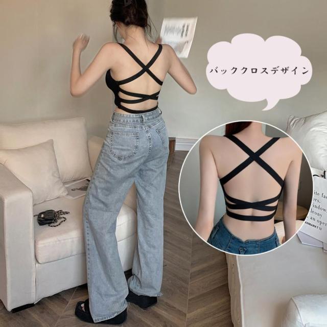 バッククロスキャミソール カップ付き セクシー下着 ブラキャミ 背中開き Uネック 厚カップインナー リブブラトップ 黒