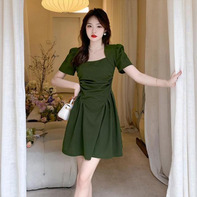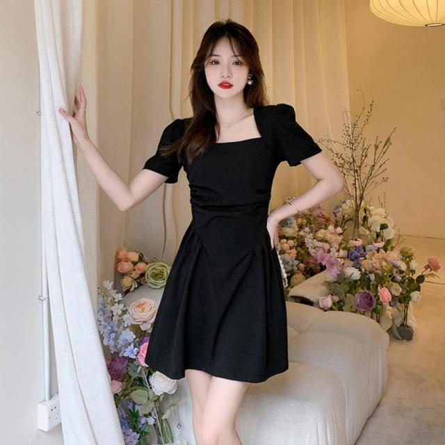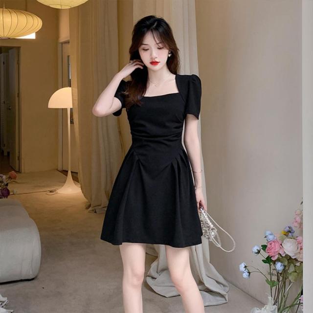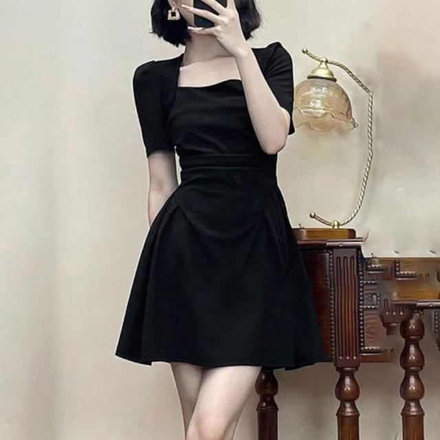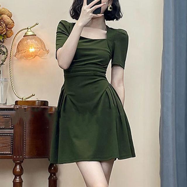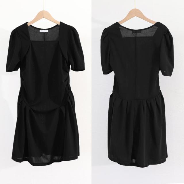 フレアワンピース 着やせ ハイウエスト ギャザーワンピ きれいめカジュアル 大人可愛い ショート丈ワンピ スクエアネック