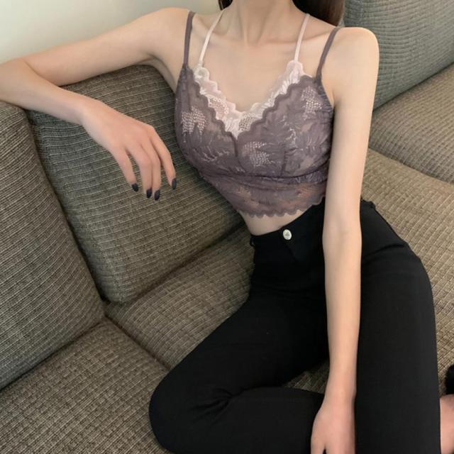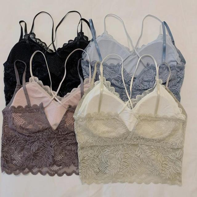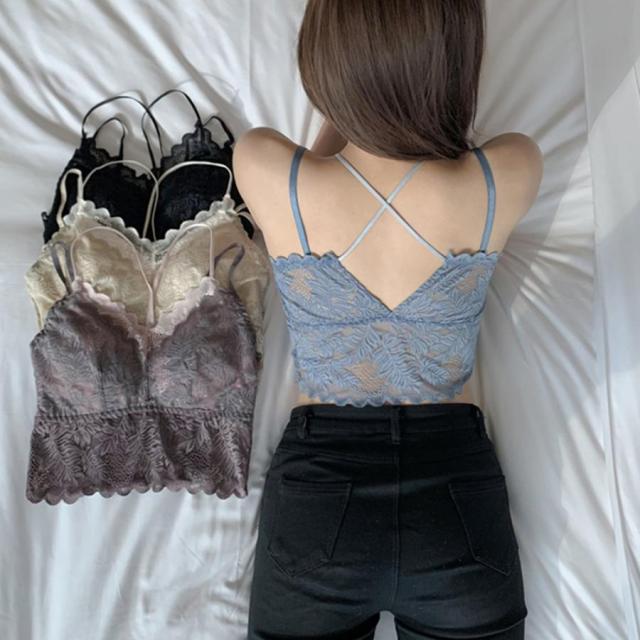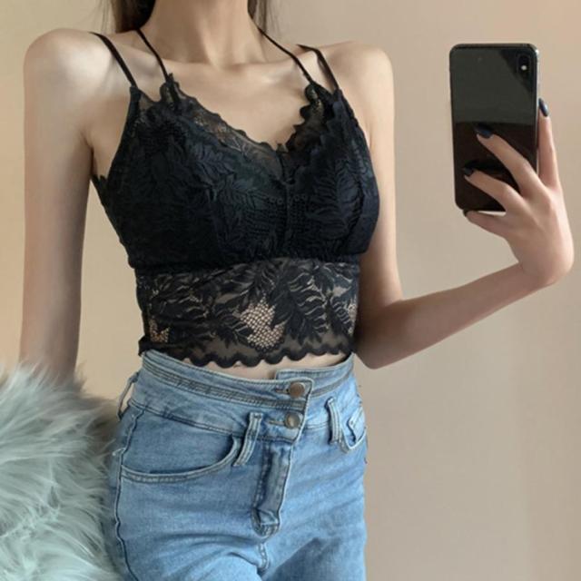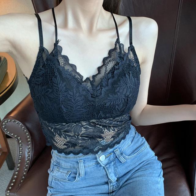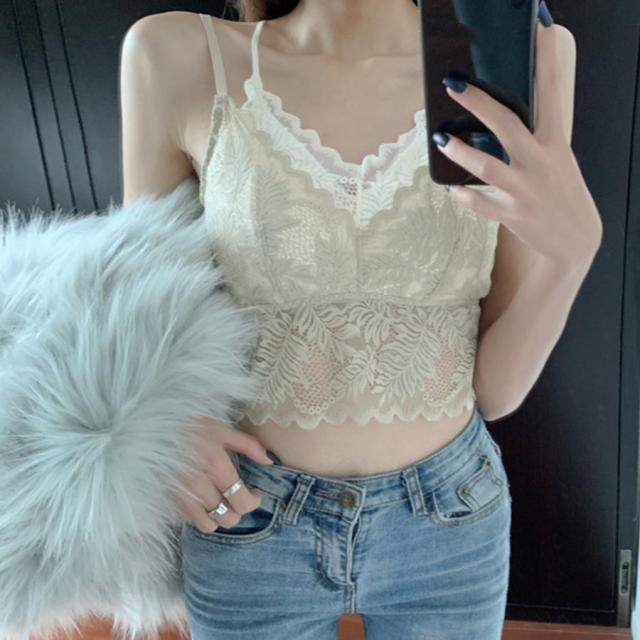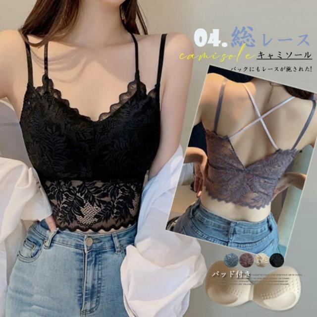 総レースキャミソール Vネック チラ見せ インナー パッド付き ショート丈 ノンワイヤー 韓国 春物 透け バックレース【ゆうパケット可】