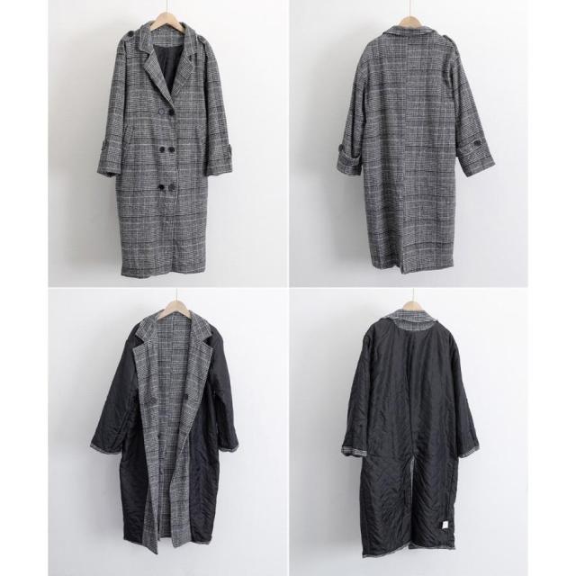 中綿入りで暖か、纏うだけで大人らしい品格とこなれ感が漂う韓国DESIGNのグレンチェック柄ロング丈チェスターコート