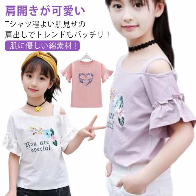 オフショルダー カットソー 綿 女の子 韓国子供服 Tシャツ キッズ ブラウス 夏服 ジュニア カジュアル 肩開き 子供服 肩出し ベビー服 tシャツ スポーツウェア 可愛い おしゃれ スポーツウェア 女の子 おしゃれ 送料無料 110-120 130 140 150 半袖