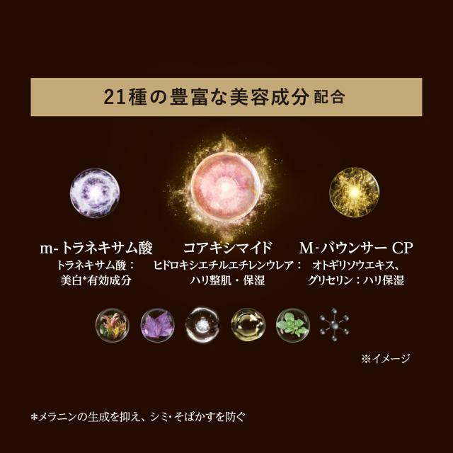 | 薬用高機能美容液。 独自の先進技術と独自の高機能成分コアキシマイド(ヒドロキシエチルエチレンウレア(ハリ整肌・保湿))、美白*有効成分トラネキサム酸など21種の豊富な美容成分を、角層深くまで素早く届けます。 複数の大人の美肌要素に素早くアプローチ。 ハリに満ち、明るく、なめらかな肌へ導く美容液。 *メラニンの生成を抑え、シミ・そばかすを防ぐ |
