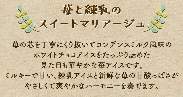 甘い練乳アイスと新鮮ないちごの甘酸っぱさが、やさしくて爽やかなハーモニーを奏でる、とびっきりデザート。
