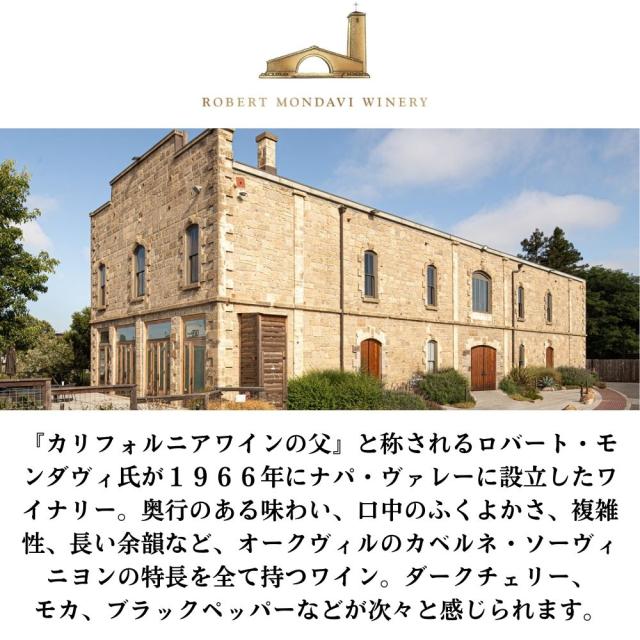 『カリフォルニアワインの父』と称されるロバート・モンダヴィ氏が1966年にナパ・ヴァレーに設立したワイナリー。奥行のある味わい、口中のふくよかさ、複雑性、長い余韻など、オークヴィルのカベルネ・ソーヴィニヨンの特長を全て持つワイン。ダークチェリー、モカ、ブラックペッパーなどが次々と感じられます。